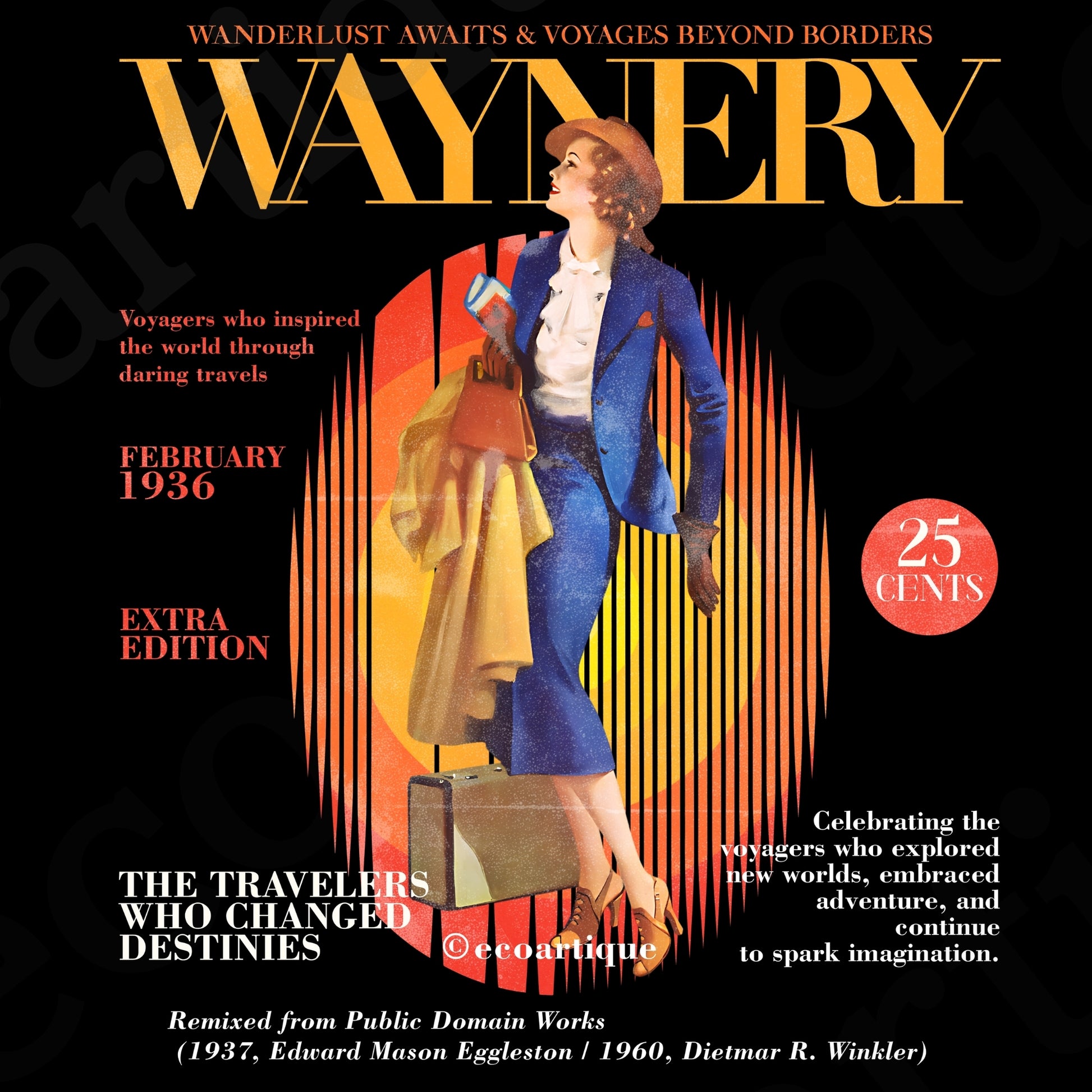 この作品は、架空の雑誌『WAYNERY』の表紙をモチーフに、1950〜80年代の古着文化が宿す“掘り出し物感”と“リアルな旅人像”を再構築。ブルートーンのスーツを纏う女性旅行者の姿は、1930年代の観光ポスターから引用されたイラスト。背景にはMITによる1960年の研究ポスターからインスパイアされたオレンジグラフィックが重なり、移動のエネルギーと希望を象徴します。