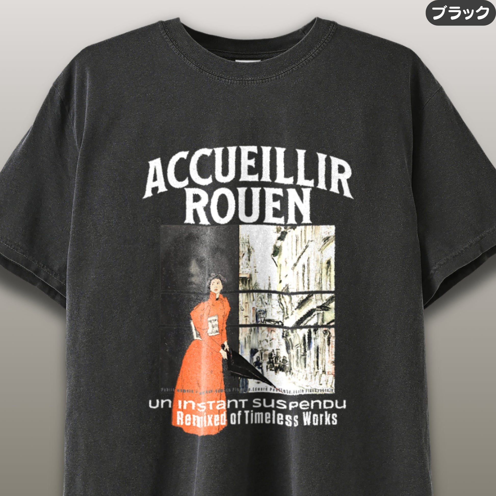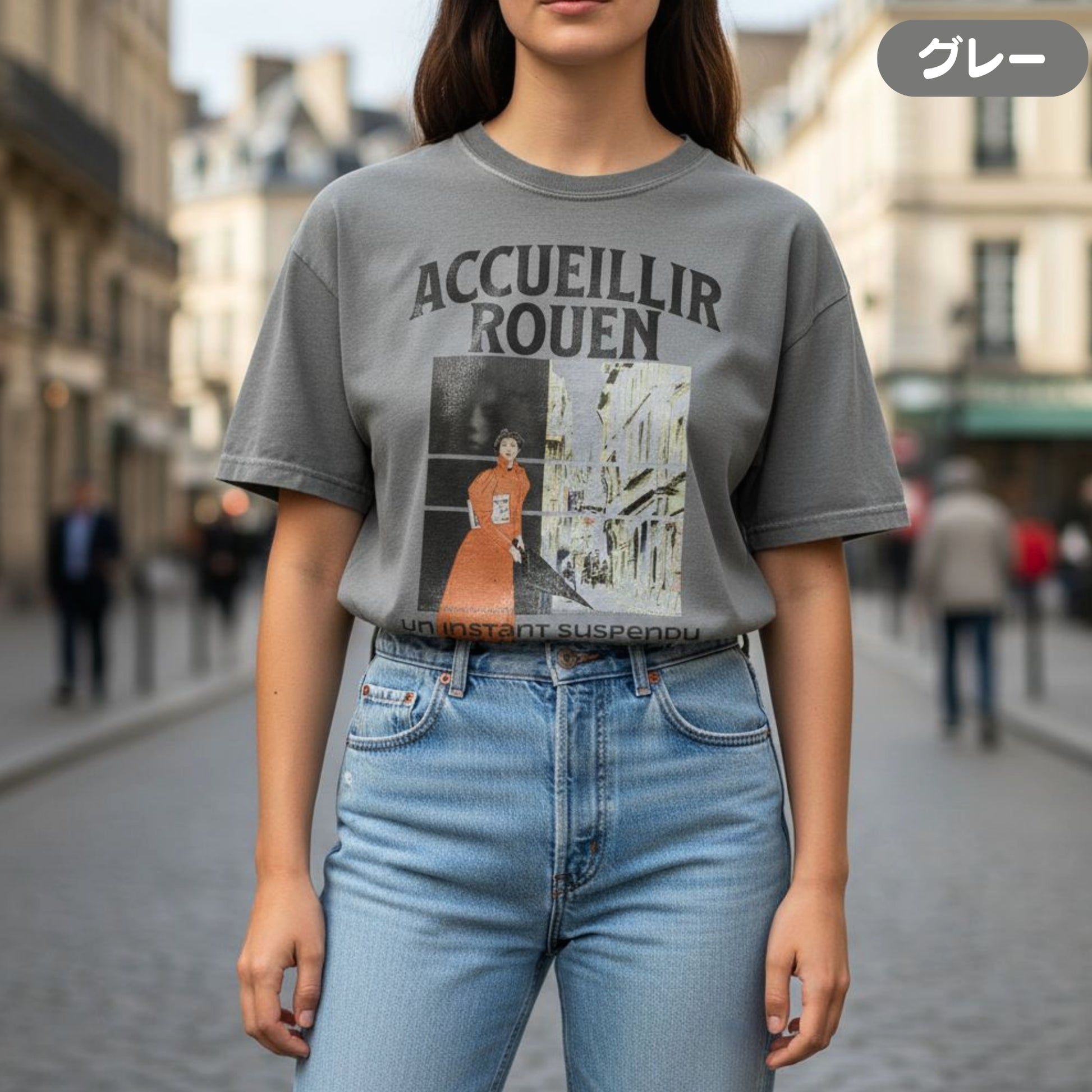 🎭「Accueillir Rouen(いらっしゃいませ ルーアン)」という仮想のフランス映画タイトルを冠し、時が止まったような一瞬=Un instant suspendu をヴィンテージスタイルで再構築。古着のような風合いのTシャツに、絵画的なスチルが舞台装置のように浮かび上がる。
