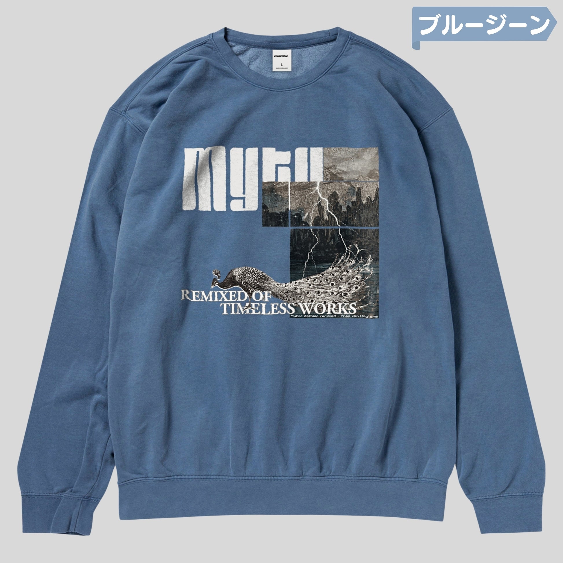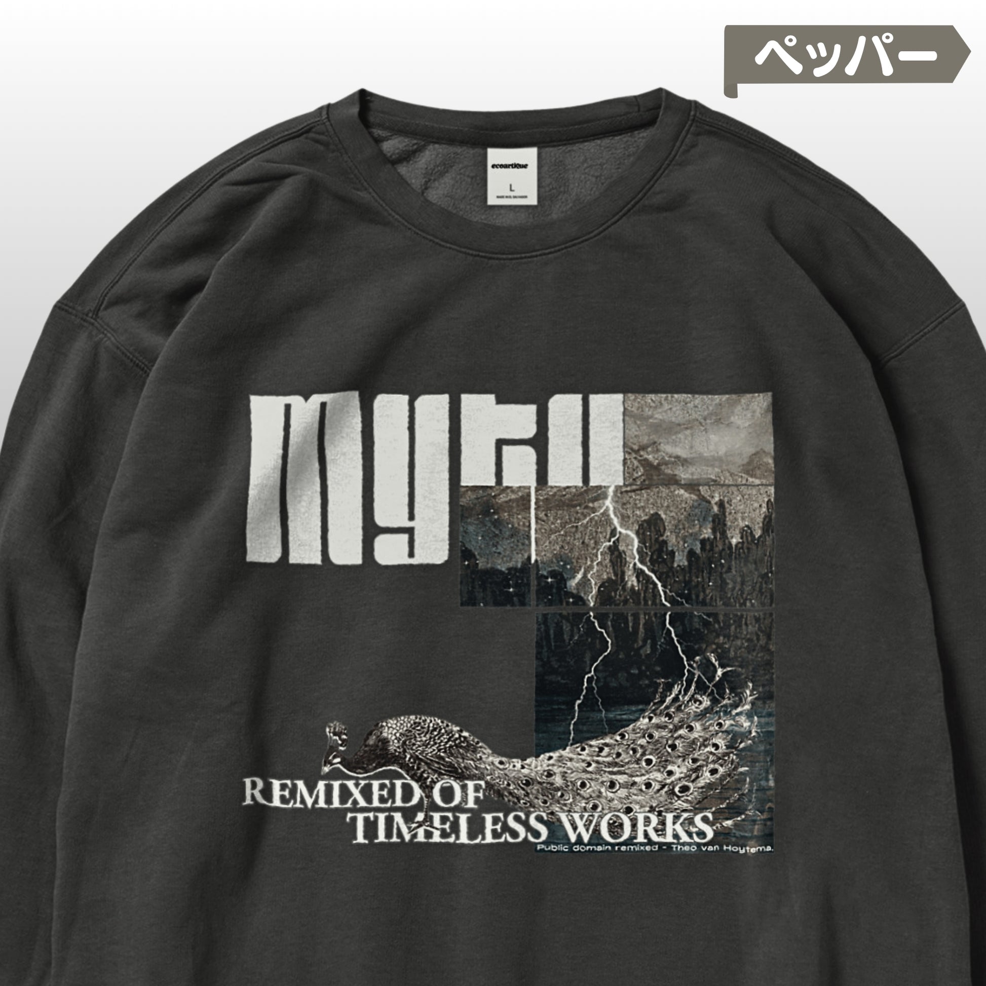 🎭「MYTH – Remixed of Timeless Works」──神話と幻想が交錯する、ヴィンテージ感あふれるビジュアルリミックス。静けさの中に雷が走り、孔雀の羽が永遠を語る。視覚詩のように語りかける一着。