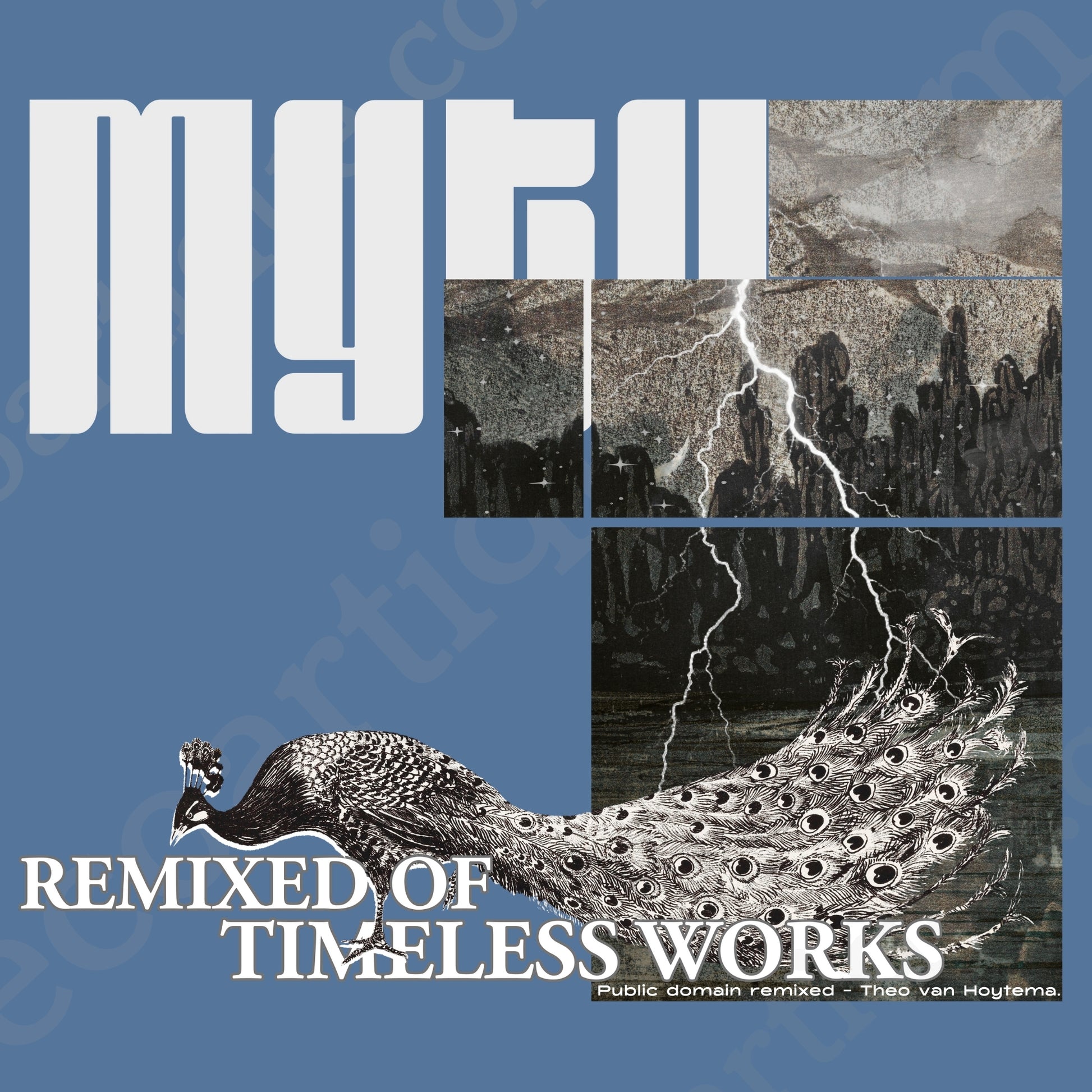 本作は、19世紀のオランダの画家テオ・ファン・ホイテマによるパブリックドメイン作品を再構成。雷が走る幻想的な風景画に、孔雀の細密なモノクロ銅版画を重ね、神話的な空気感を強調。中央に配置された“MYTH”の大胆なタイポグラフィーは、垂直構造で構成され、現代的かつ象徴的な存在感を放つ。全体にフェードやかすれを施したことで、まるで長年保管されてきた古書の表紙のような質感に仕上げている。