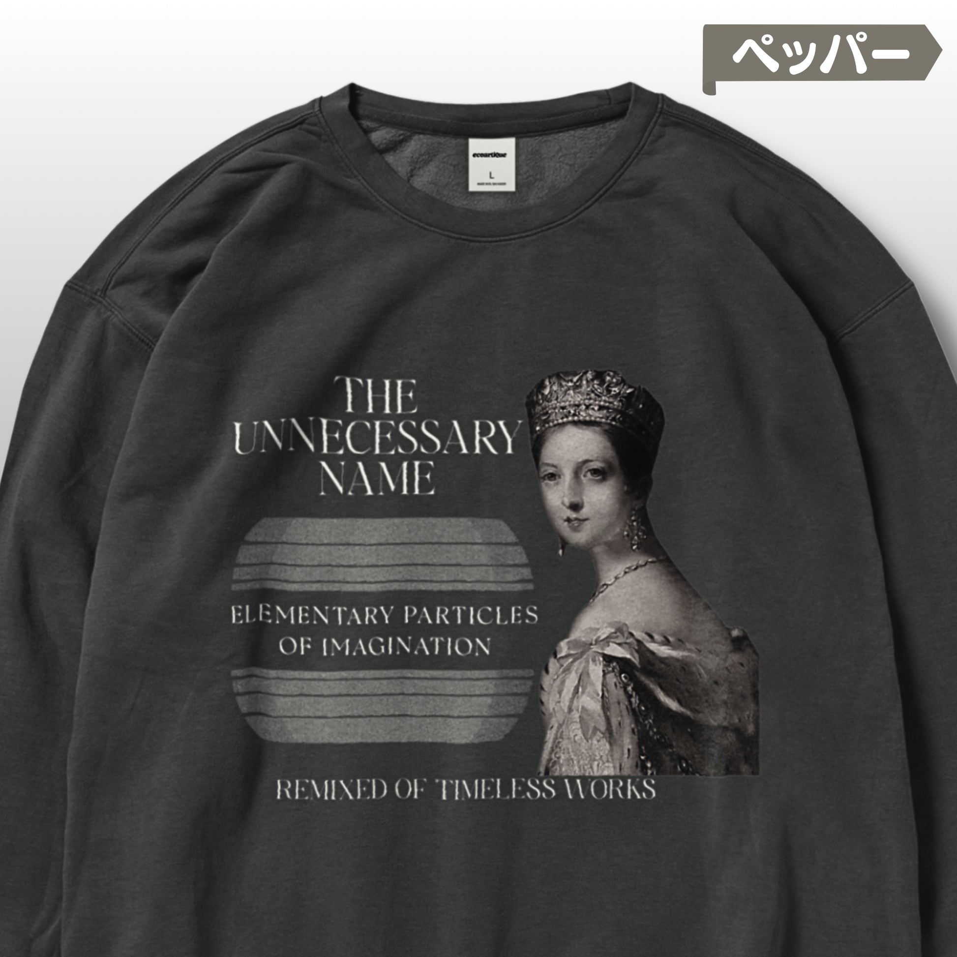 1950〜80年代の古着感がただよう、掘り出し物のようなヴィジュアル。グレーのオーバルグラフィックとクラシカルな肖像画は、まさに“REMIXED OF TIMELESS WORKS”。ややフェードしたプリントや、均整の取れたタイポの配置がリアリティを演出し、時を超えたイマジネーションの粒子が静かに浮かび上がります。