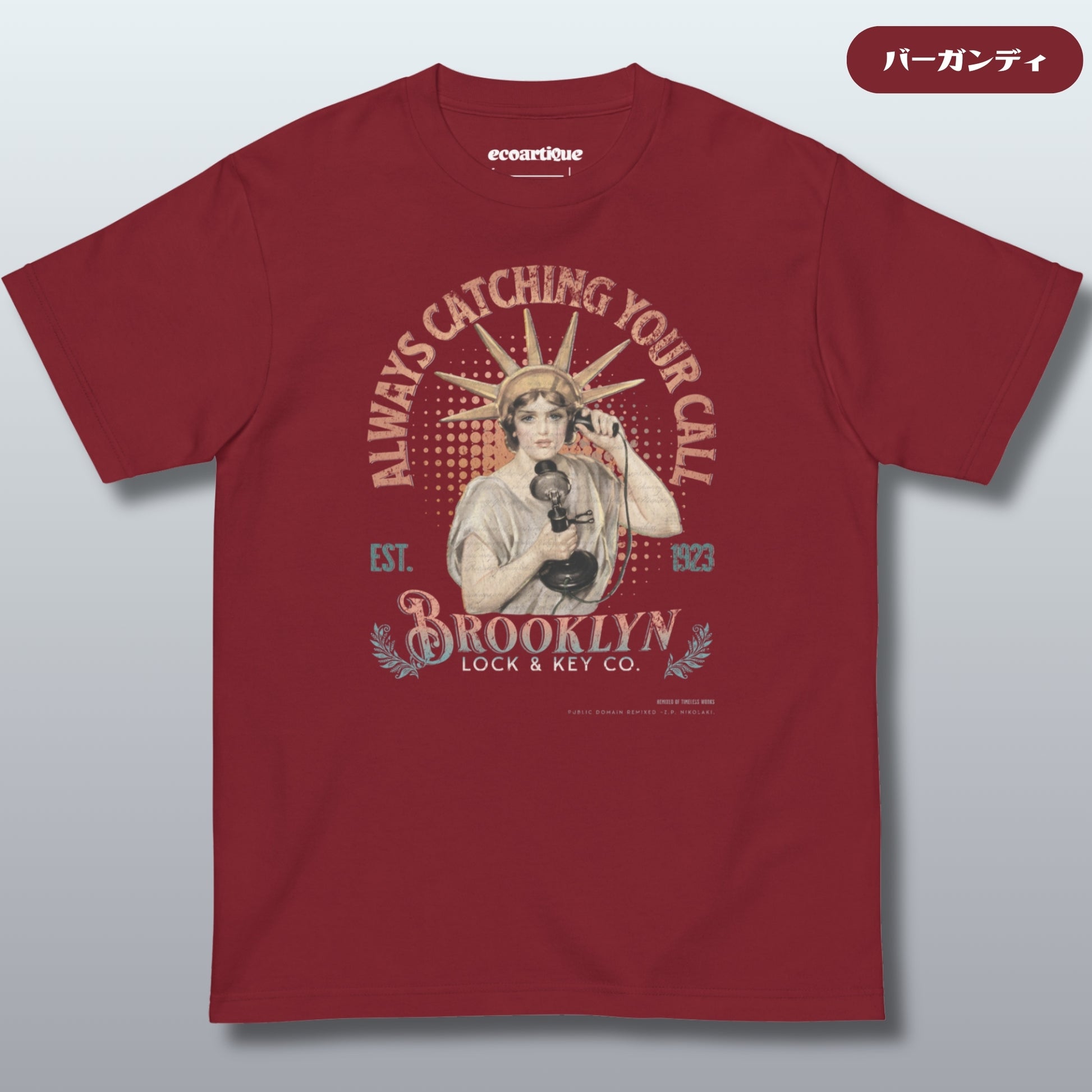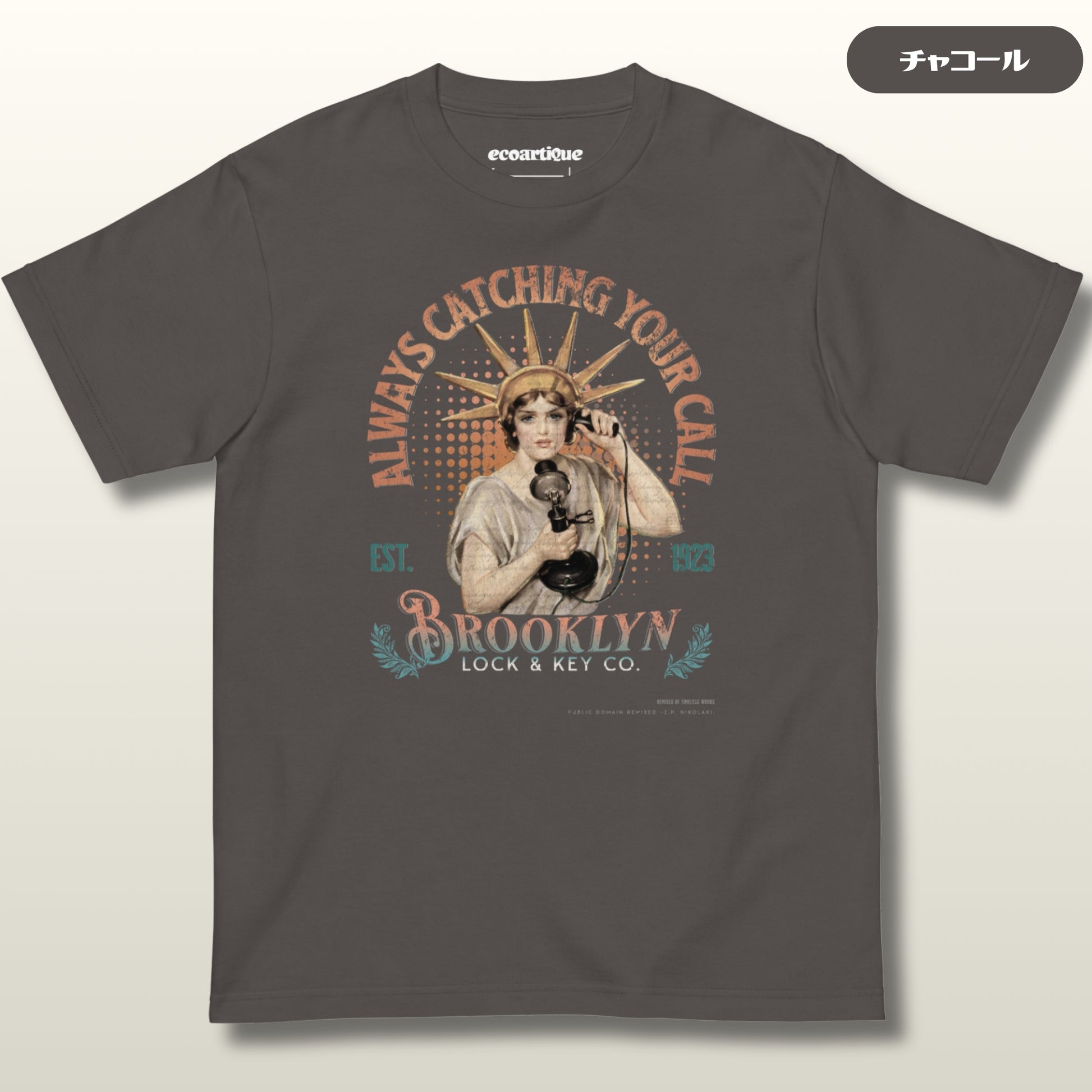“Always Catching Your Call”——1923年創業の**Brooklyn Lock & Key Co.**が、レトロな通信文化とアメリカンアイコンを融合。自由の女神がヴィンテージ電話を手にする姿が、掘り出し物のようなグラフィックで蘇る。