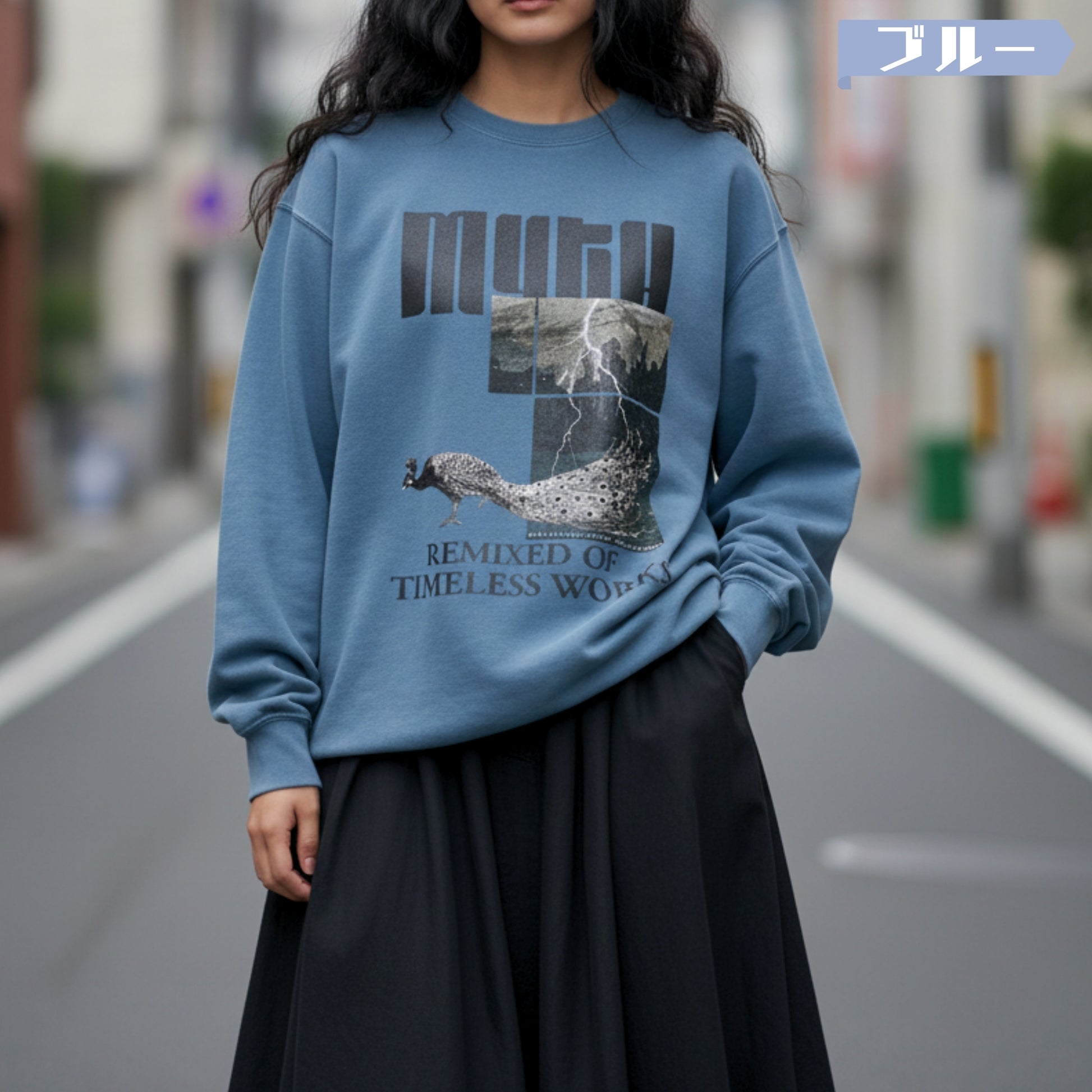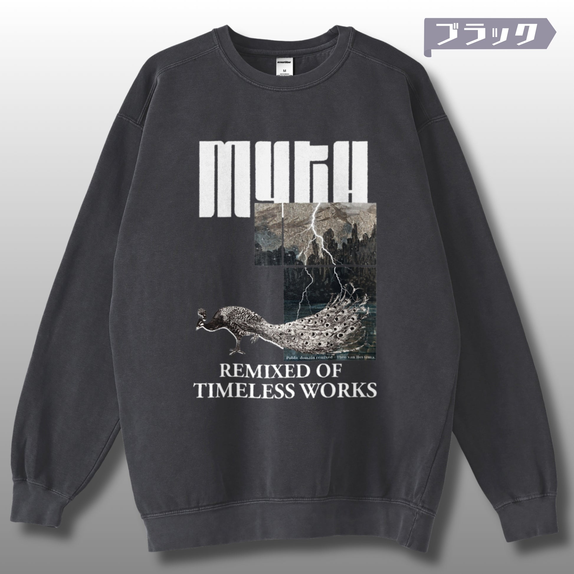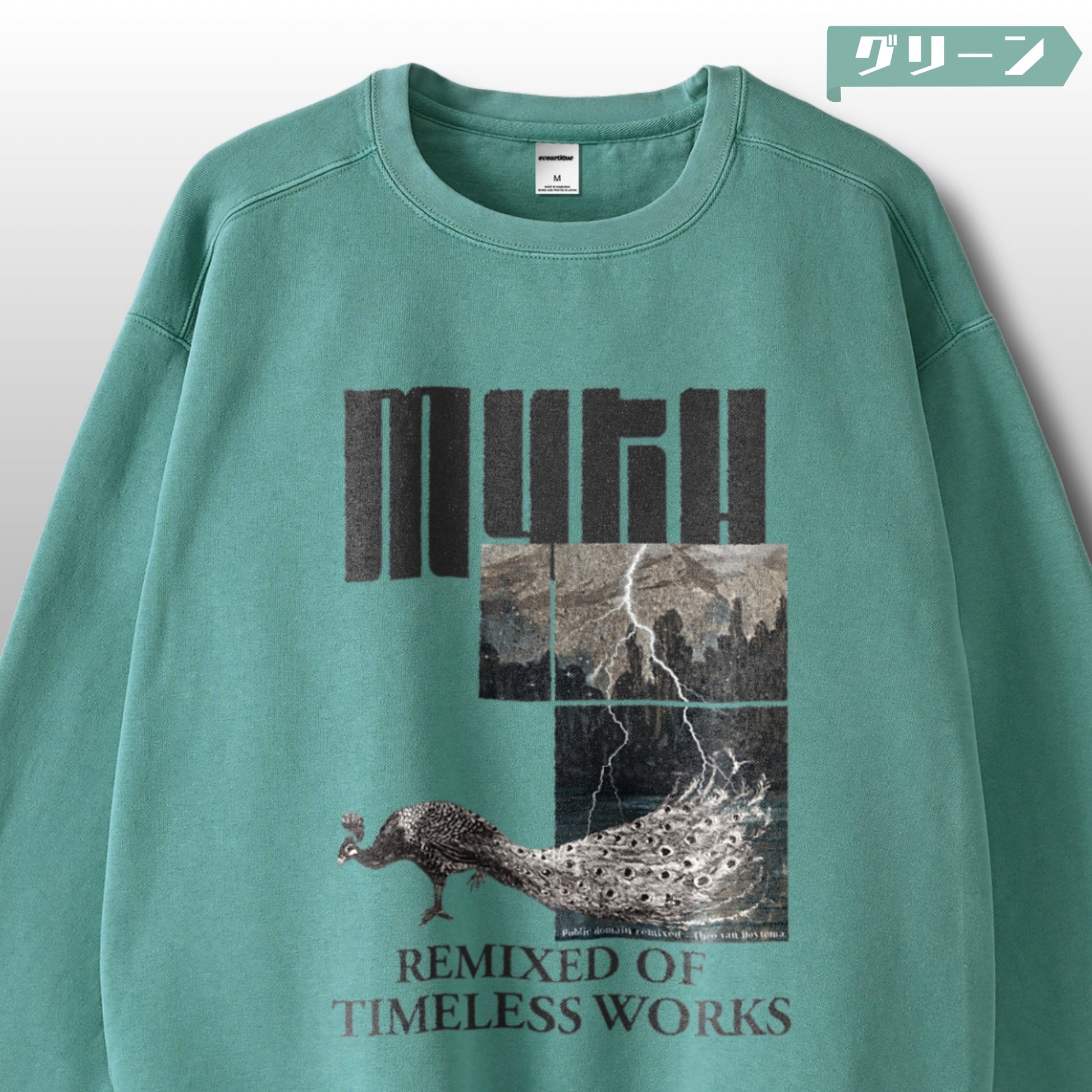 🎭「MYTH|神話的象徴の再構成」――1950〜80年代の古着感を纏い、幻想とリアリティが交差するアートスウェット。稲妻が走る風景と孔雀の静寂が重なり、神話的な象徴が現代に蘇る。
