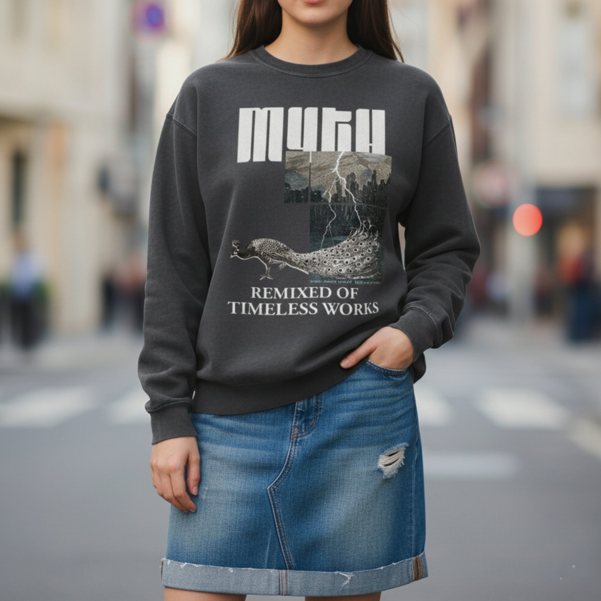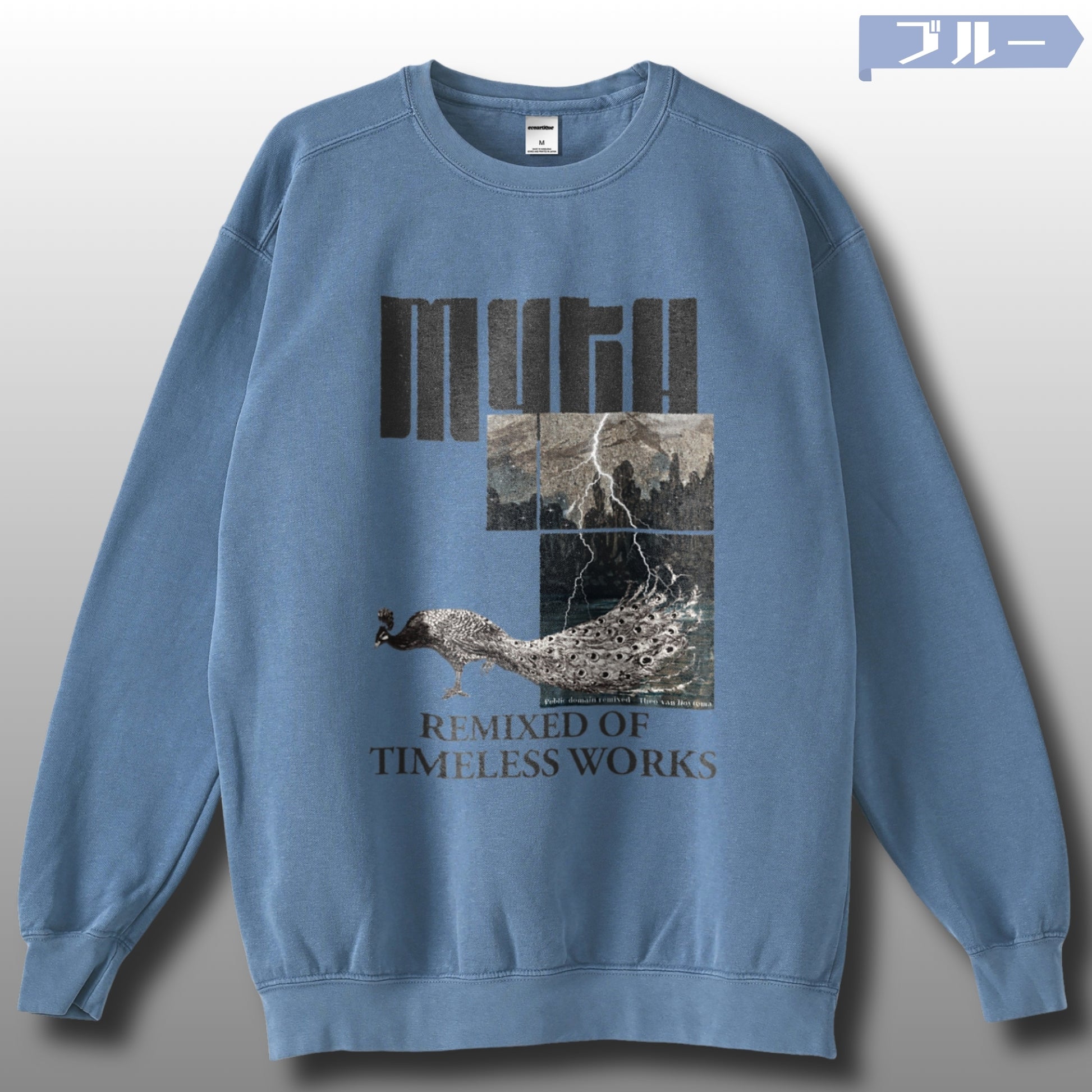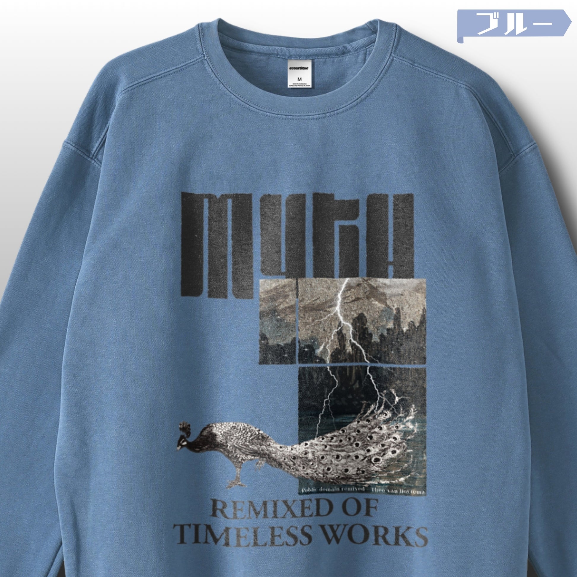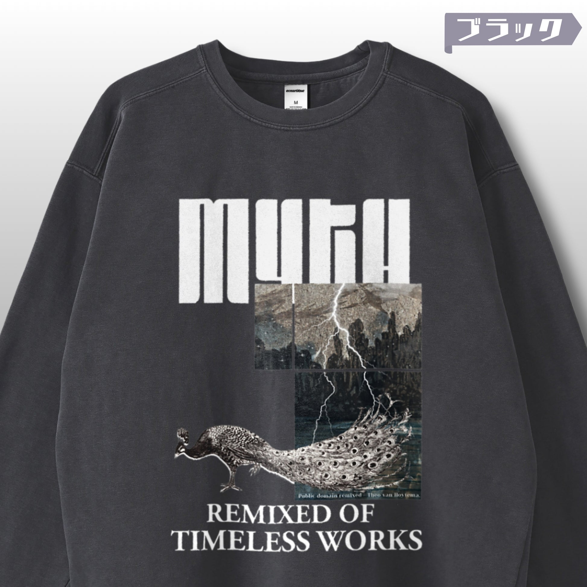 🎭「MYTH|神話的象徴の再構成」――1950〜80年代の古着感を纏い、幻想とリアリティが交差するアートスウェット。稲妻が走る風景と孔雀の静寂が重なり、神話的な象徴が現代に蘇る。