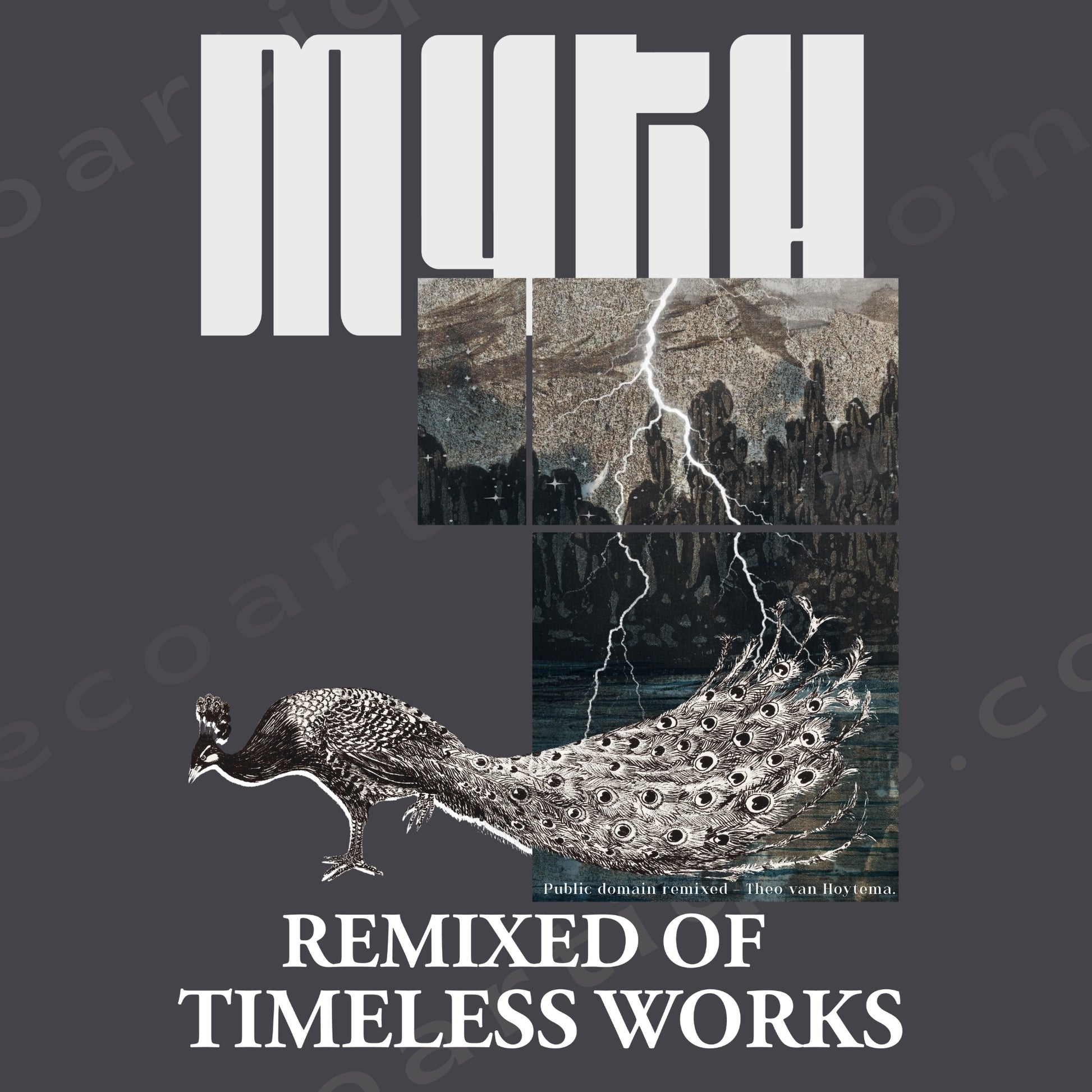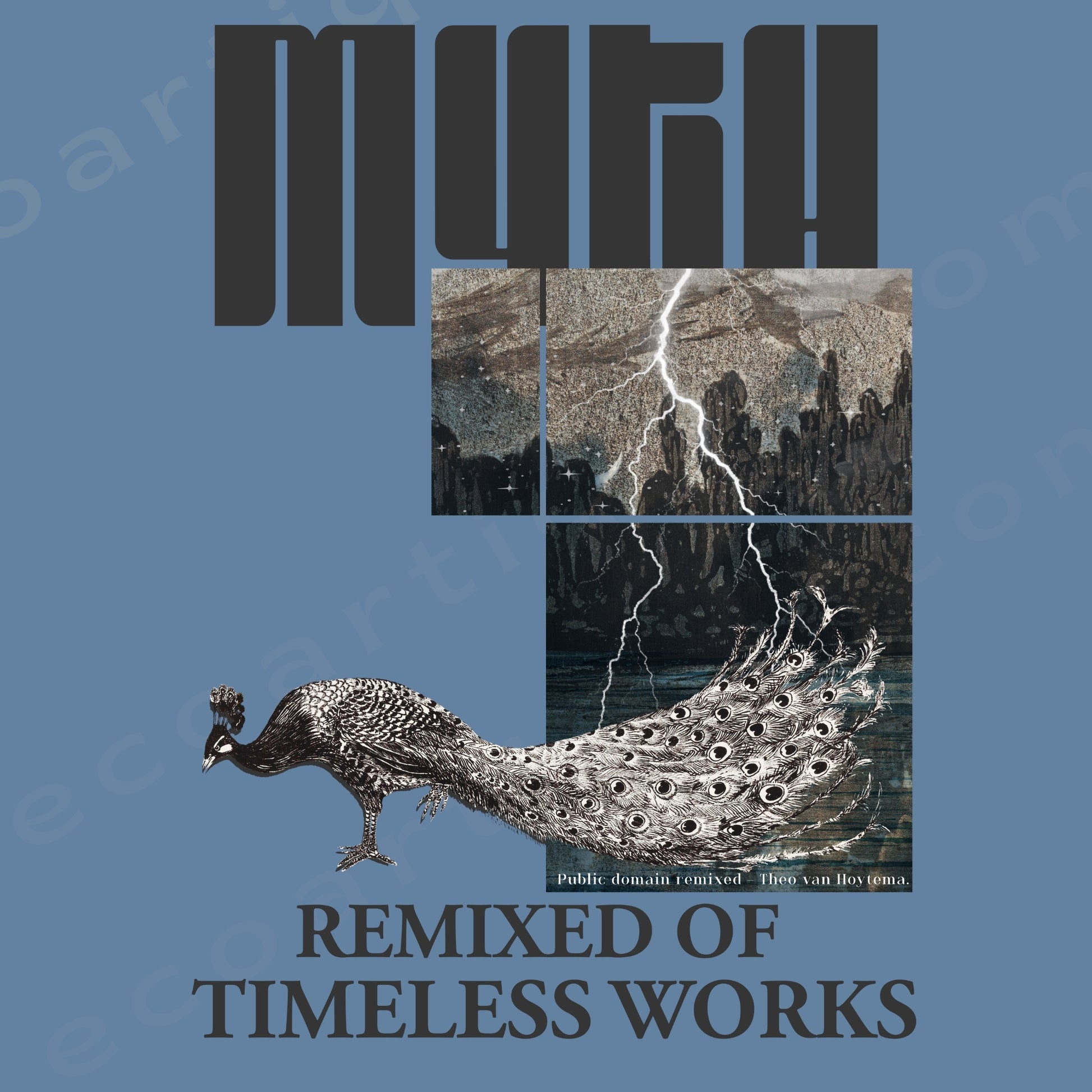 テオ・ファン・ホイテマの銅版画と木版鳥類画を再構成し、褪せた色調と稲妻のコラージュで構成。濃淡のあるモノクロームをベースに、タイポ「MYTH」は縦構成で神秘性を強調。9.5オンスのガーメントダイスウェットにプリントされ、ウォッシュ加工がノスタルジアとヴィンテージ感を演出。