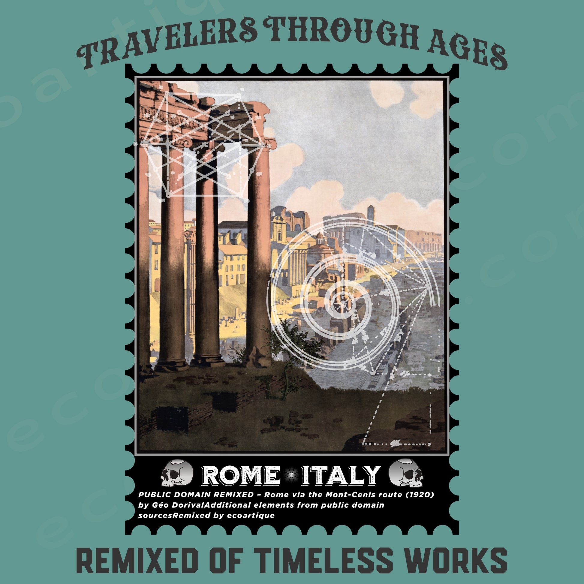 🎭「TRAVELERS THROUGH AGES」の文字が象徴するのは、時を旅するスーベニア感。Géo Dorivalによる1920年のポスターに、幾何学構成とアーキテクチャル・グラフィックをレイヤードし、「ROME」「ITALY」といったクラシックなタイポが、ヴィンテージ旅行広告のように響く一枚。