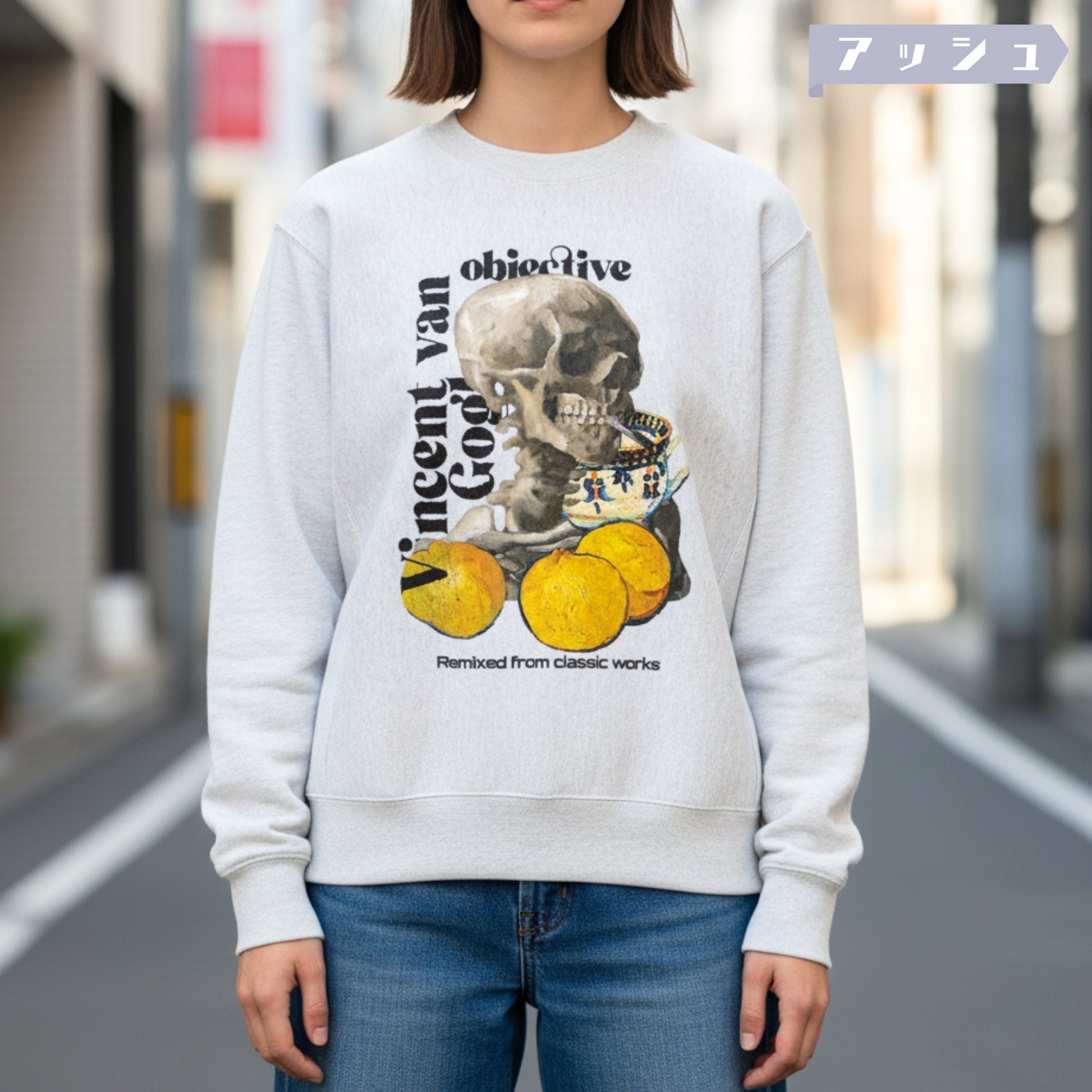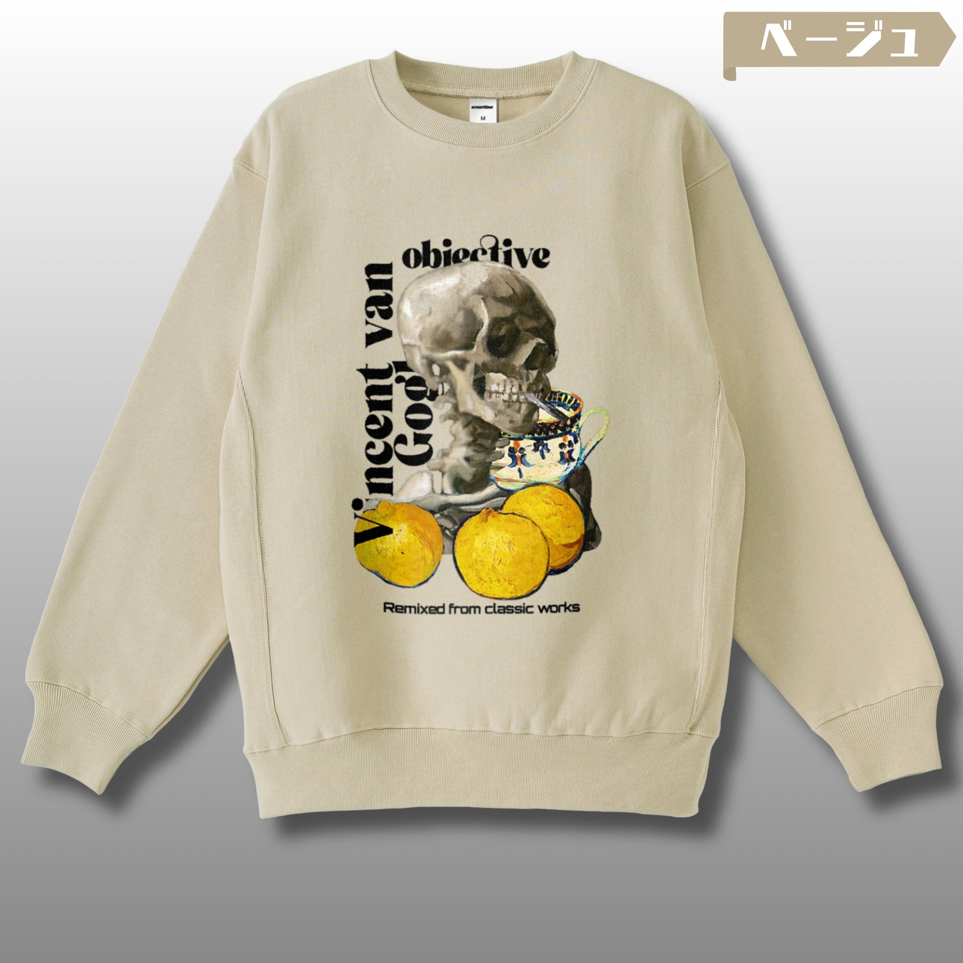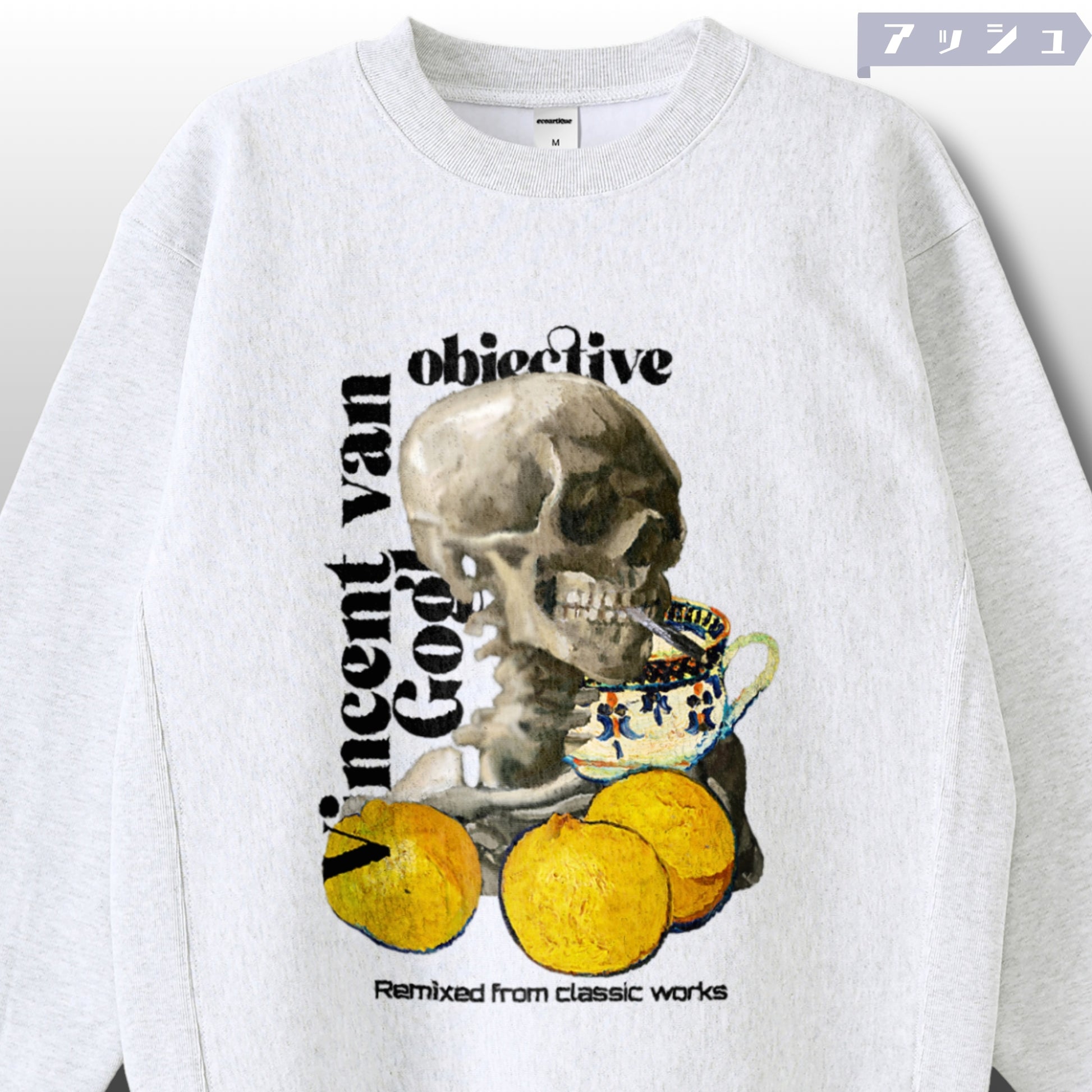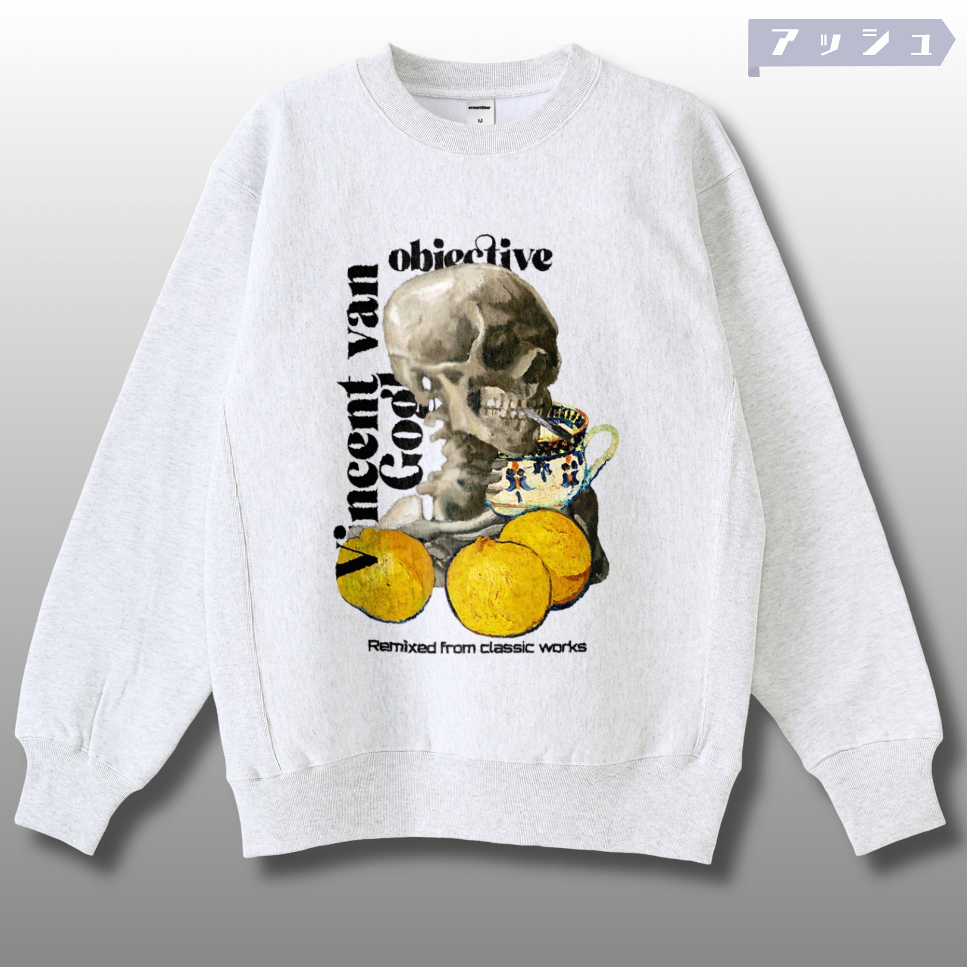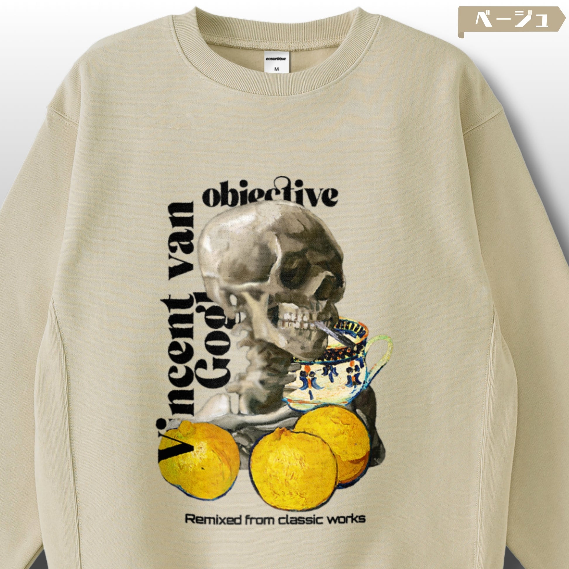 スウェットに描かれたのは、タバコをくわえるスカルと彩色のカップ、果実──van Goghが描いた“生と死”の断片たちを再構成した、FINE ART的アプローチの一枚。骨の無機質なブラウンと果実の鮮やかな黄色のコントラストが、視覚に訴えるアフォリズムのように響きます。