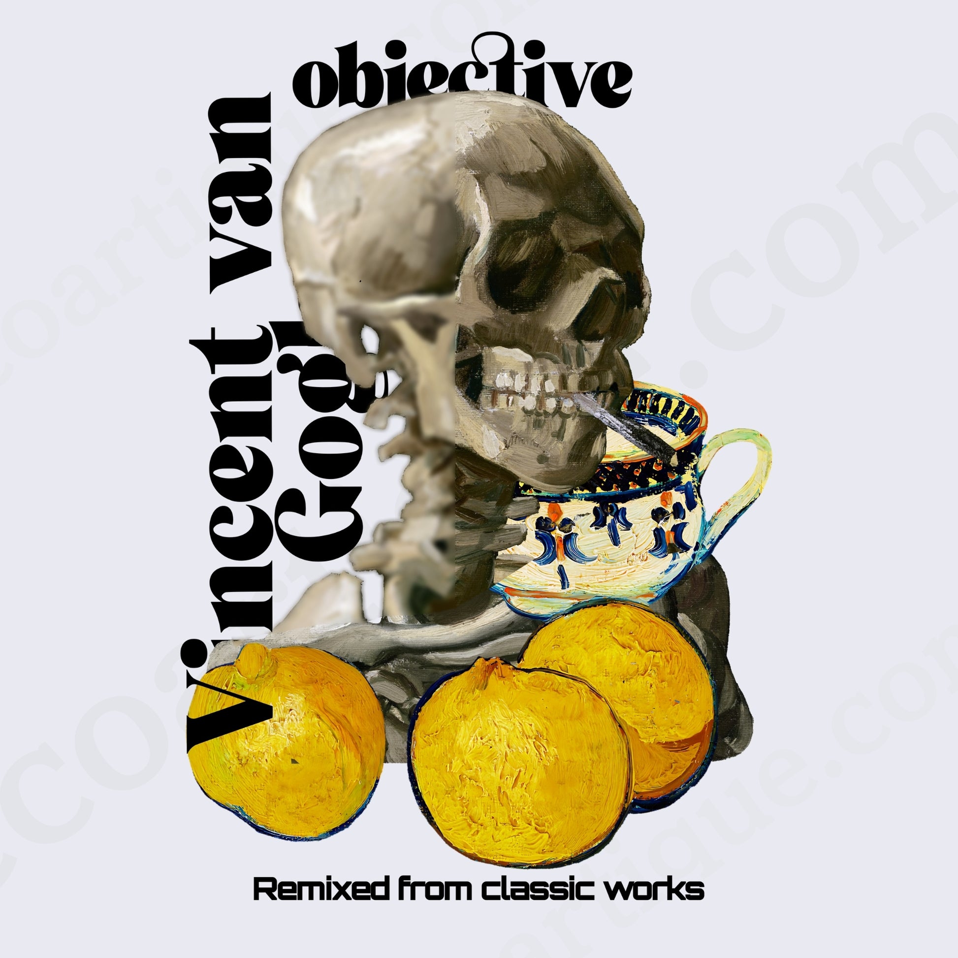 886年制作の《煙草をくわえた骸骨》と1888年の静物画《Still Life》から主要モチーフを抜粋し、縦型タイポグラフィ「Vincent van Gogh」+フレーズ「objective」「Remixed from classic works」を配置。色彩の対比と構図の余白が“静謐”と“視覚の余韻”を生み、クラシカルでありながら挑発的な一枚に。