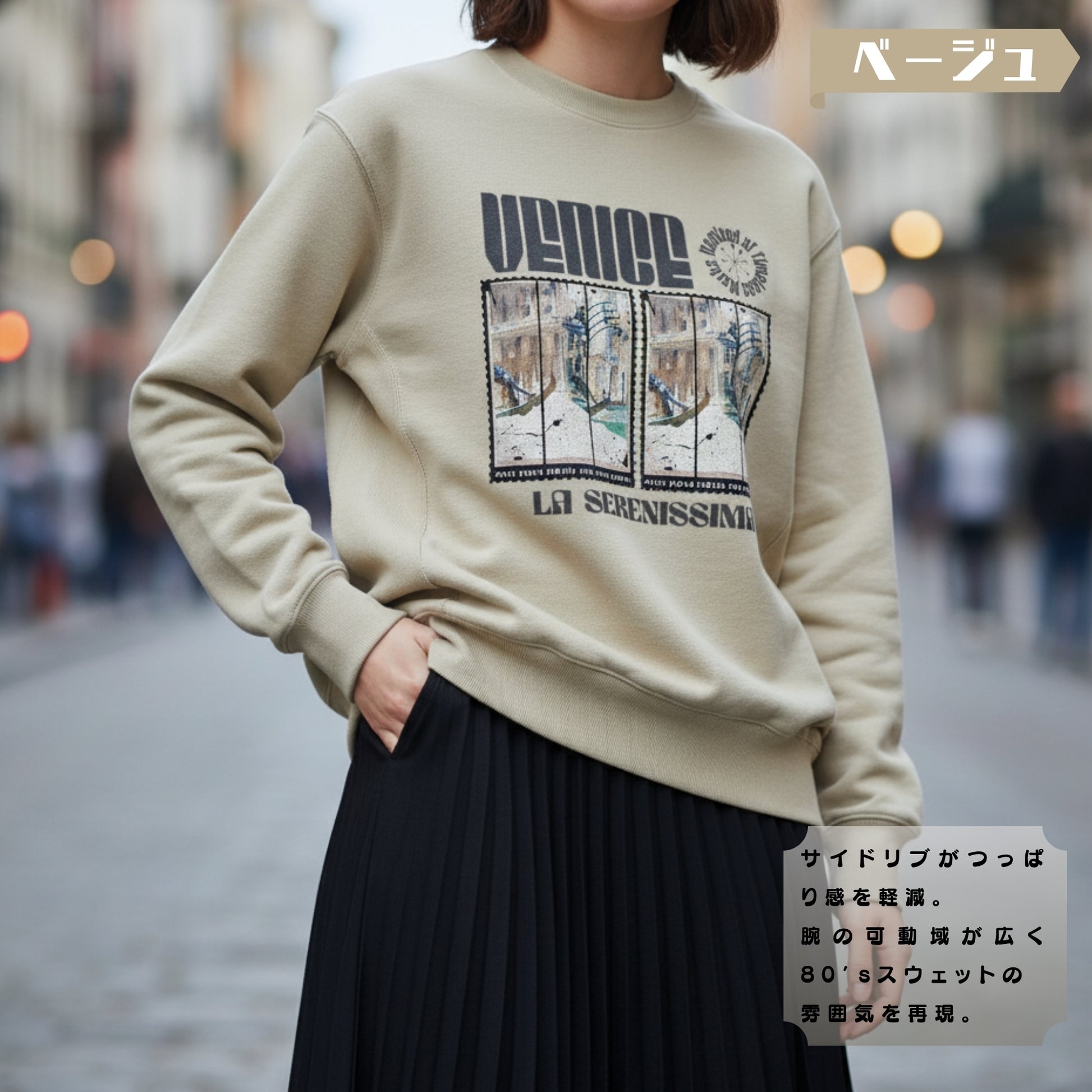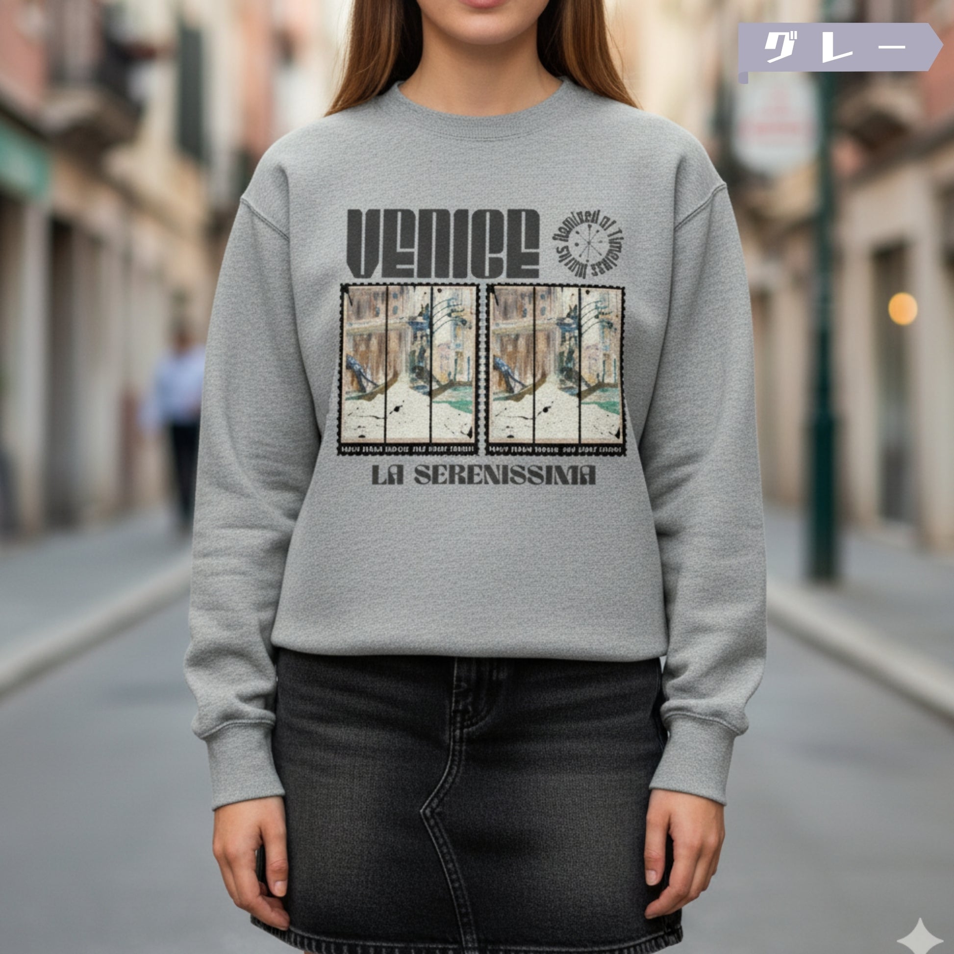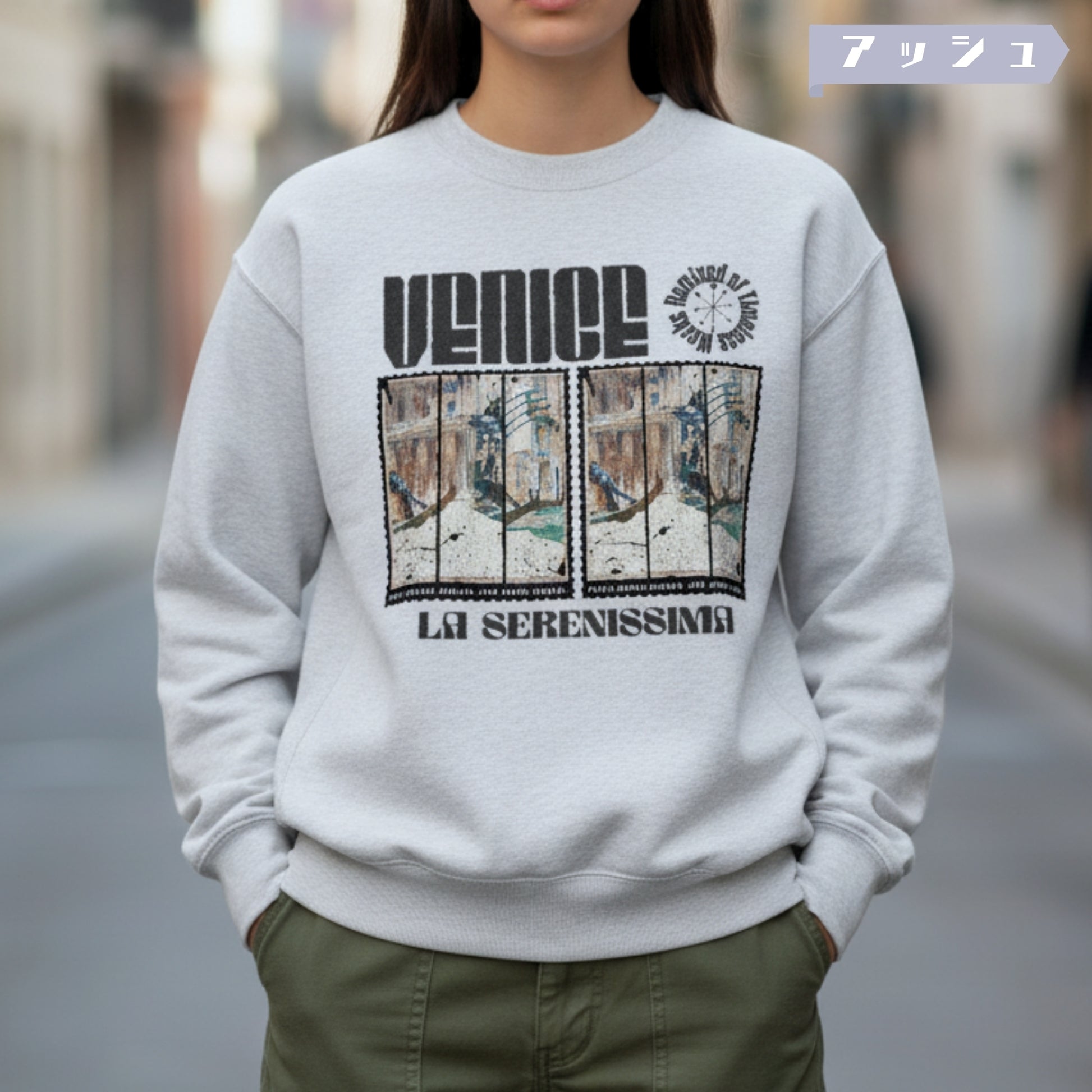 クラシック水彩画をモチーフに、ポスターフレーム風レイアウトで大胆に再構築。褪せたパレットで描かれた運河沿いの建築とゴンドラ、そこへ落ちるインクのドリップや消印風タイポが、ノスタルジアとヴィンテージ感を際立たせます。構図にはアシンメトリーなカットを取り入れ、広告的アプローチを加味。12オンスの厚手スウェットに載せることで、風合いのある“布地上のアートピース”として完成しています。