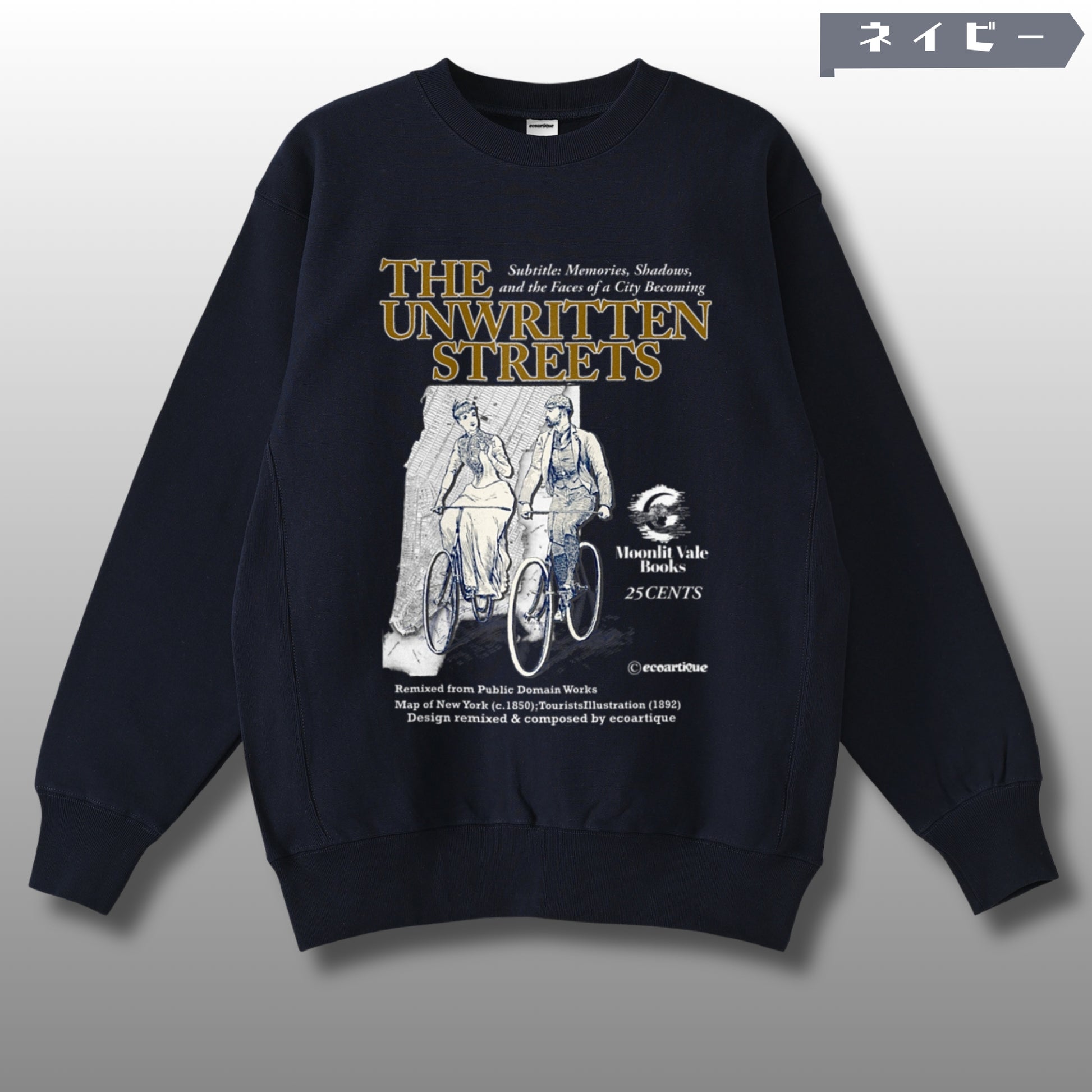 この表紙デザインは、1850年頃のニューヨーク地図を背景に、1892年の観光ポスターから抜き出した自転車に乗るカップルを重ねた、架空の書籍カバーとして再構成された作品です。褪せた紙の質感やセピア調の風合いが、ヴィンテージの空気を纏わせ、街の記憶をたどる“未だ書かれぬ物語”を視覚化しています。幻想的な月と女性のロゴは、架空の出版社「Moonlit Vale Books」の象徴として、物語に静かな余白と詩情を添えています。