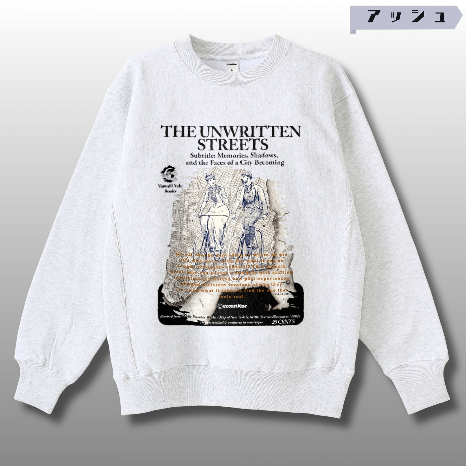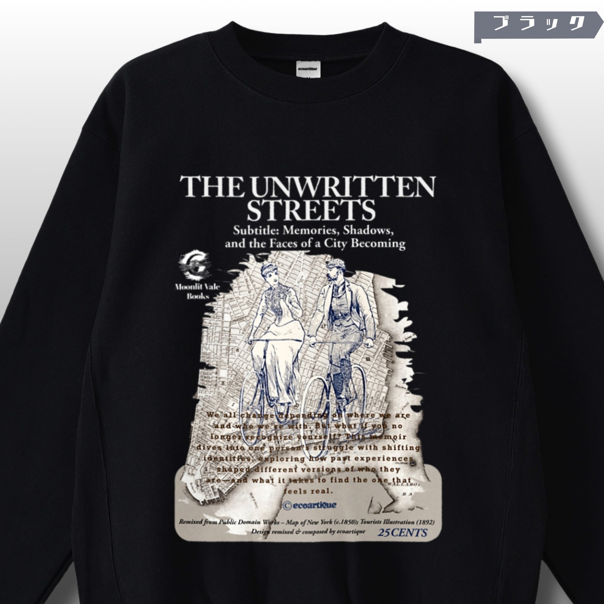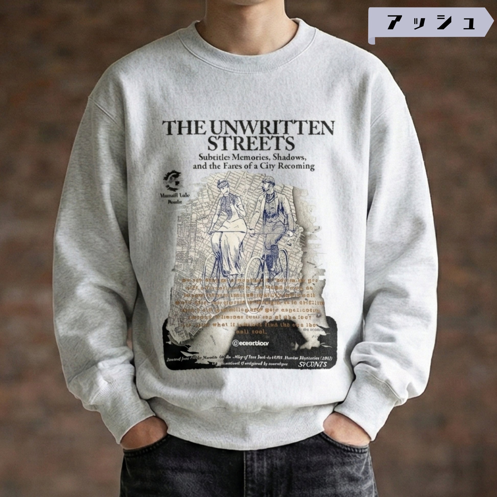 🎭縫い上げた後に製品染めとウォッシュ加工を施すことで、一点ずつわずかに異なる“色ムラ”と“こなれたアタリ”が生まれます。まるで何年も着込まれた古着のような、奥行きのあるヴィンテージ表情が魅力。“THE UNWRITTEN STREETS”──まだ誰もページを開いていない都市の通りを舞台に、1950〜80年代の古着テイストと掘り出し物のような質感をまとわせたブックカバースタイルの一枚。記憶と影が混ざり合う都市の断片を、架空の出版社“Moonlit Vale Books”の物語として描き出しています。