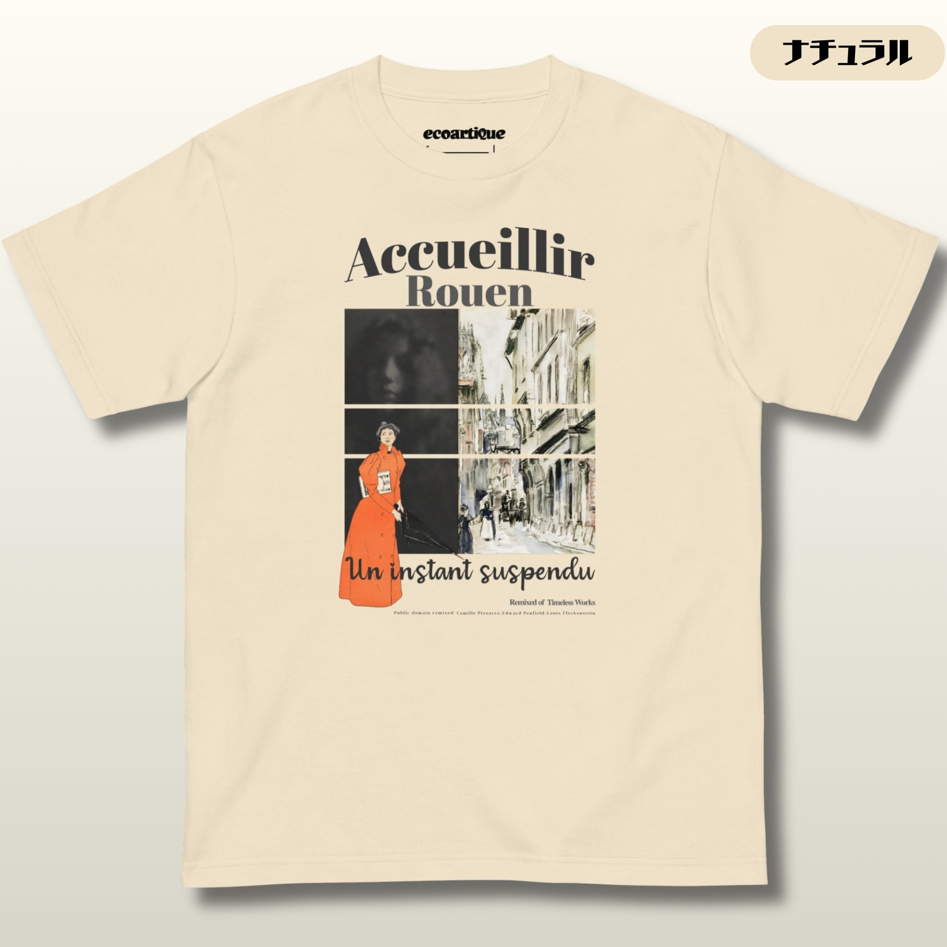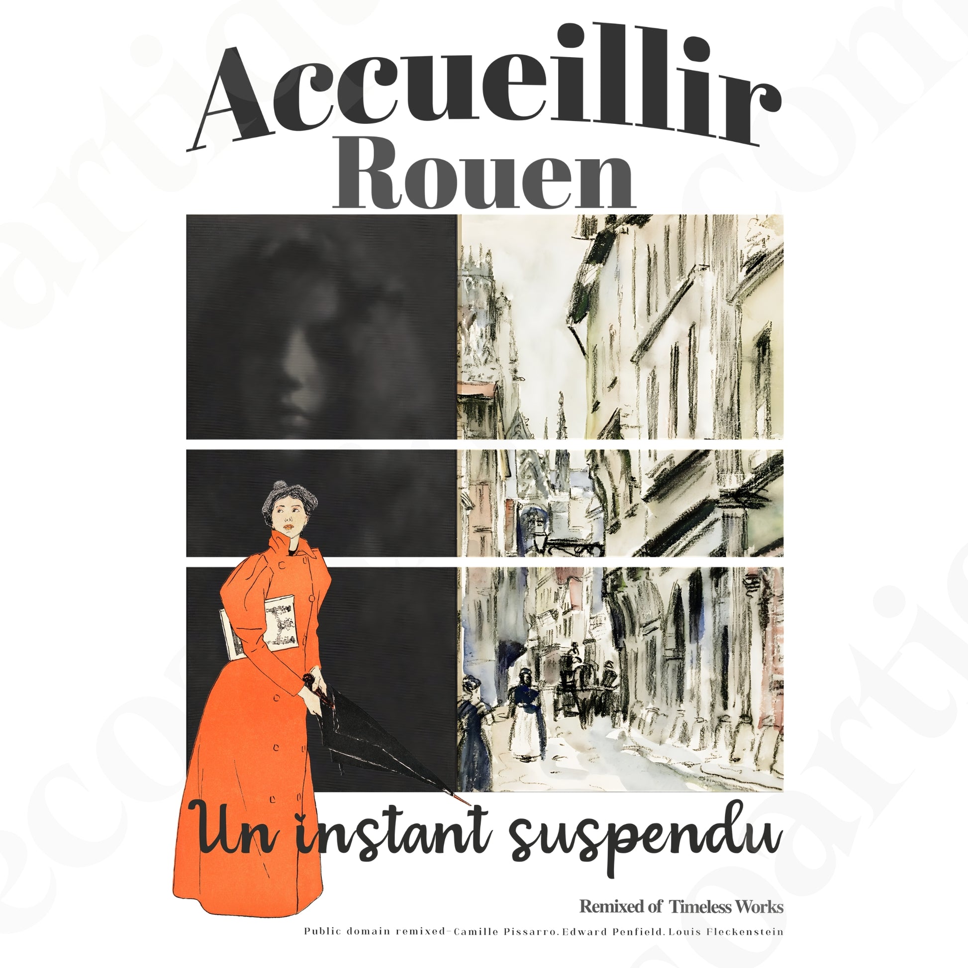 🎭「Accueillir Rouen(いらっしゃいませ、ルーアン)」というタイポグラフィが誘うのは、まるで時を忘れた旅先の街角。フランス・ルーアンの街並みとともに、「Un instant suspendu(時が止まったような一瞬)」という詩的なフレーズが、旅の記憶を静かに閉じ込めたような一枚。