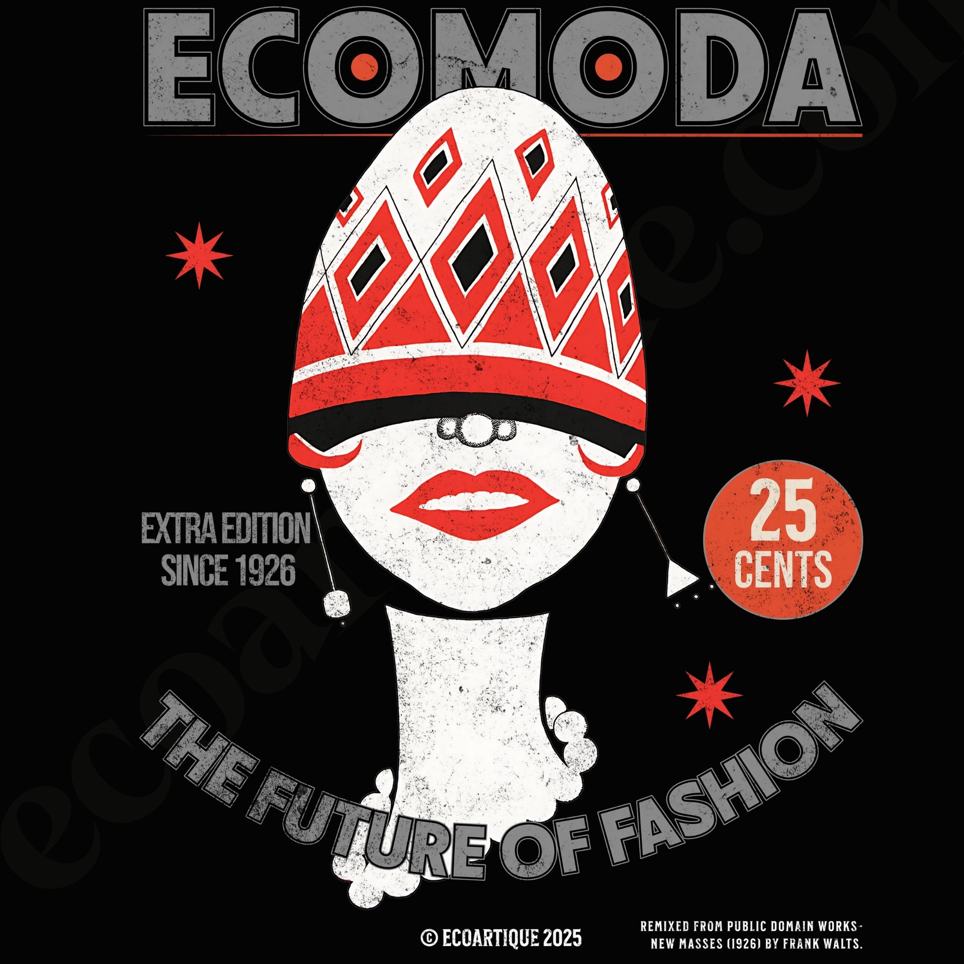 ベースには、Frank Waltsによる1926年の『New Masses』表紙イラストをリミックス。背景は漆黒、グラフィックはレッド×ホワイト×ブラックの3色構成で構築され、古典的なシルクスクリーンポスターのような風合いを再現。上部の**"ECOMODA"タイポはインダストリアル感を纏い、「25 CENTS」や「EXTRA EDITION」**の要素が、雑誌的ヴィンテージディテールを強調。ロゴや装飾のかすれ加工が、「実際に刷られた古い印刷物」のようなノスタルジアを醸します。