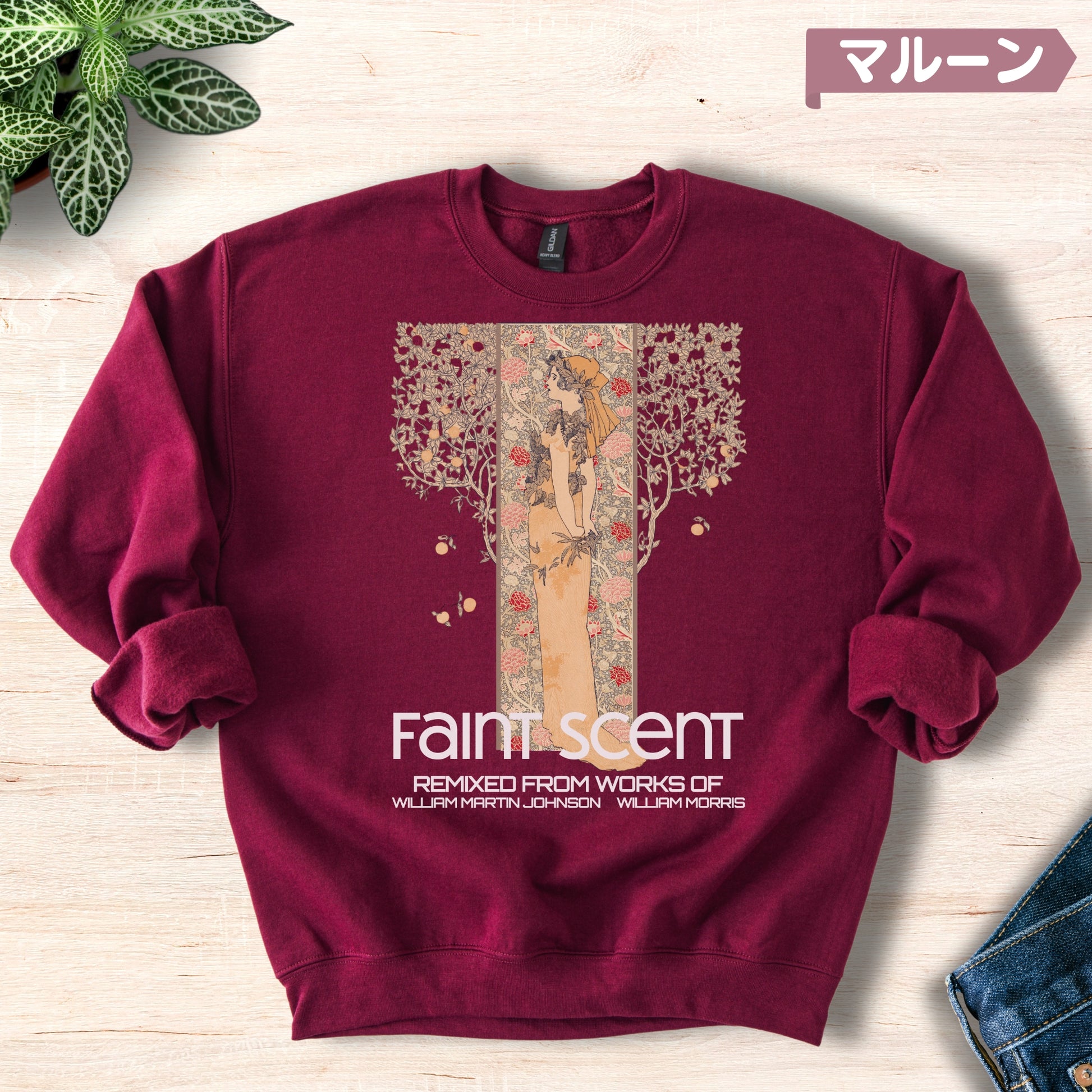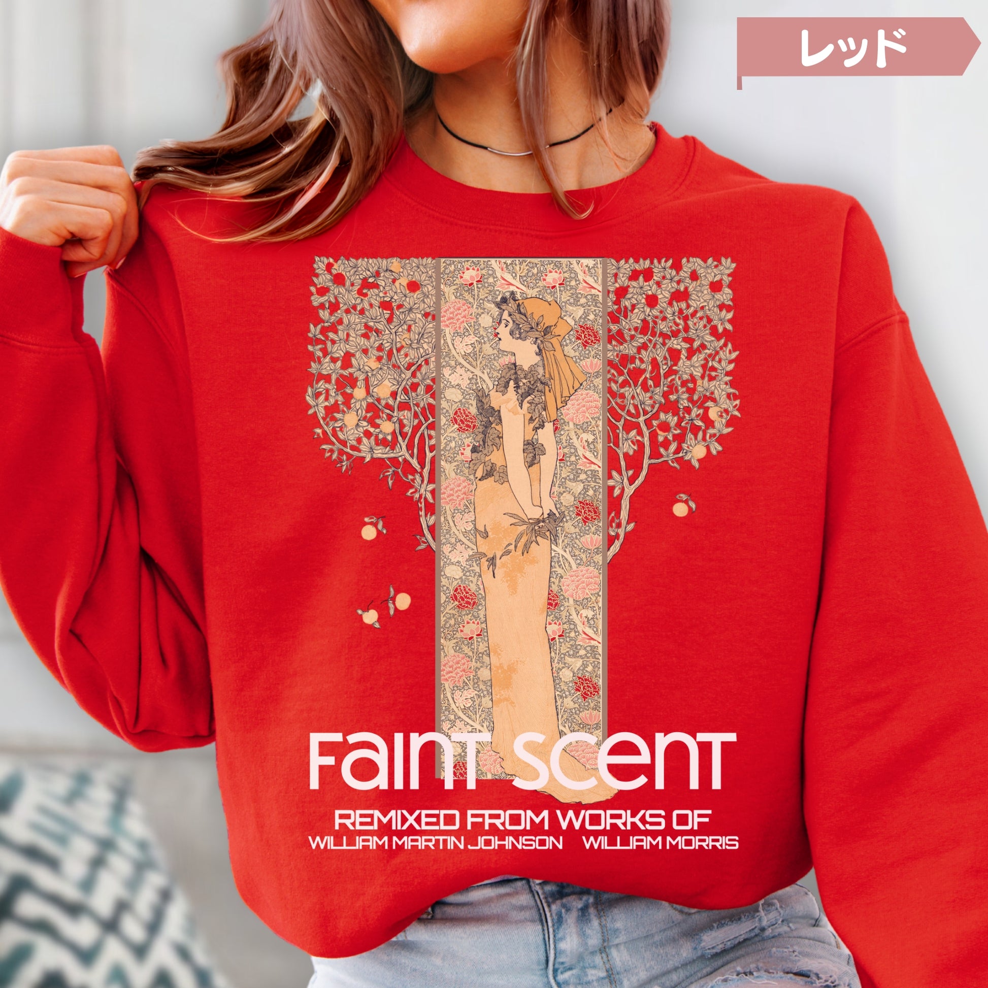 ポスターアートに描かれた女性像をメインに据え、背景にはボタニカルパターンを大胆に配置。両サイドにはシンメトリーな樹木モチーフを添え、静止した時間の中に優雅なリズムを宿す構図。全体に流れるヌーディトーンとくすみカラーの調和が、上品かつセンシュアルな余白を生み出す。“faint scent”というフレーズが、視覚表現に漂う儚さを言語化し、ストリートとアートの架け橋となる。