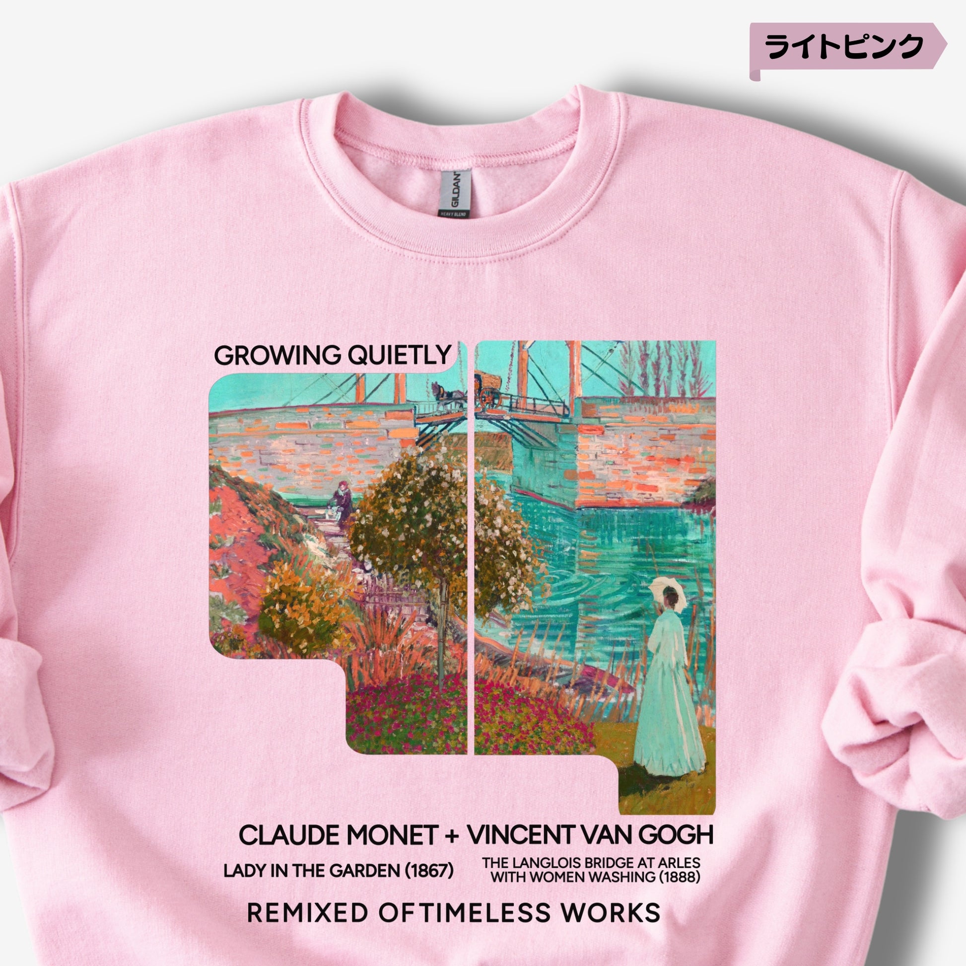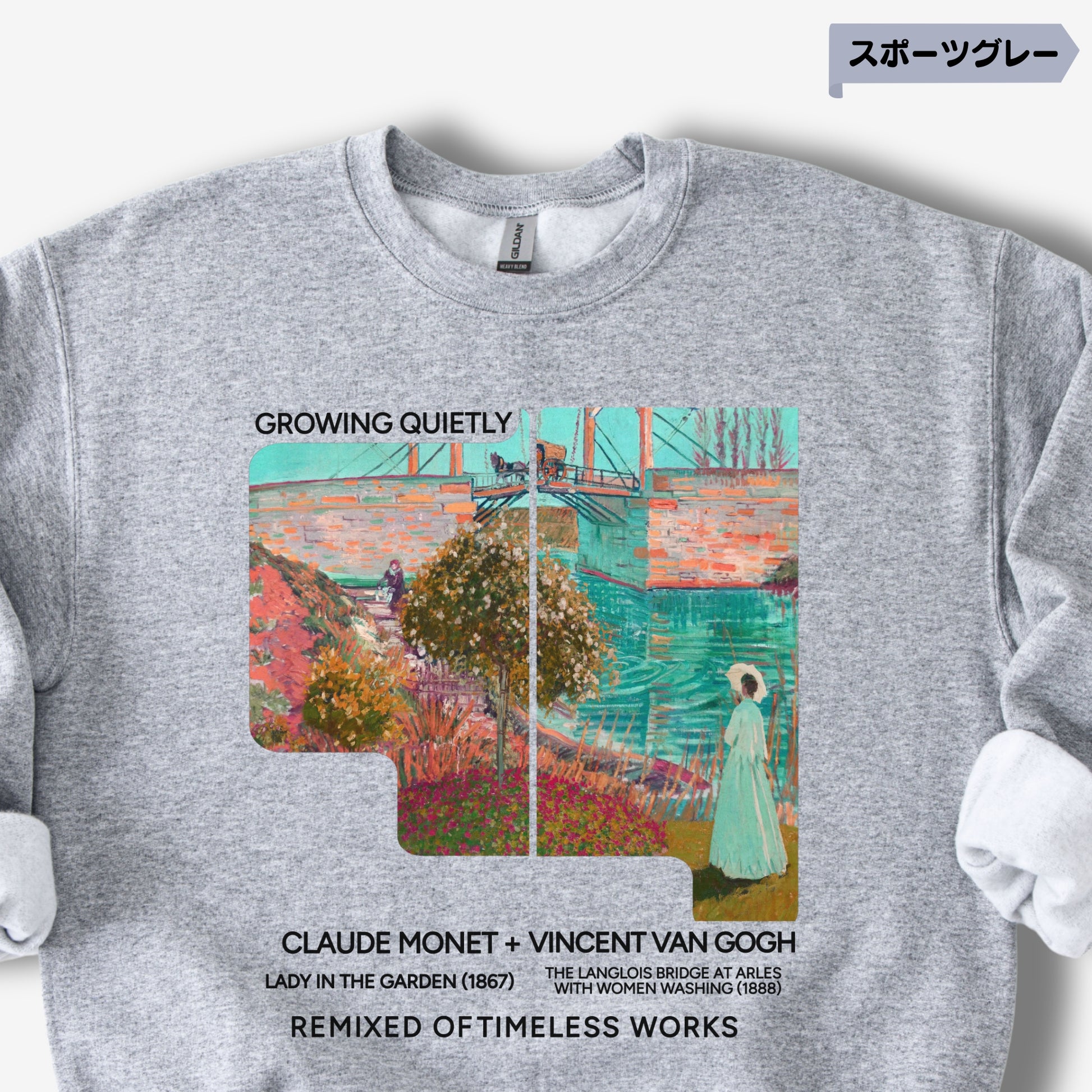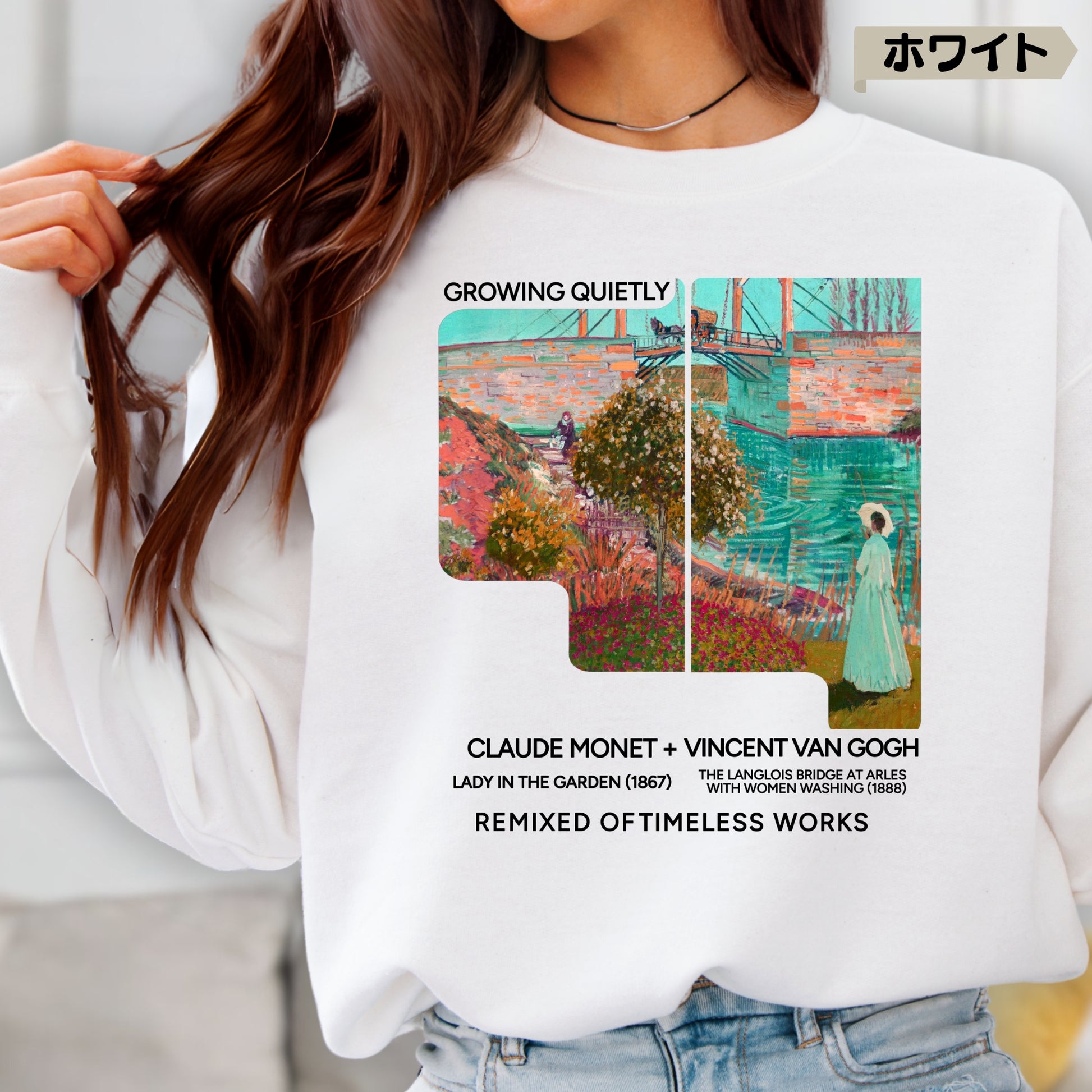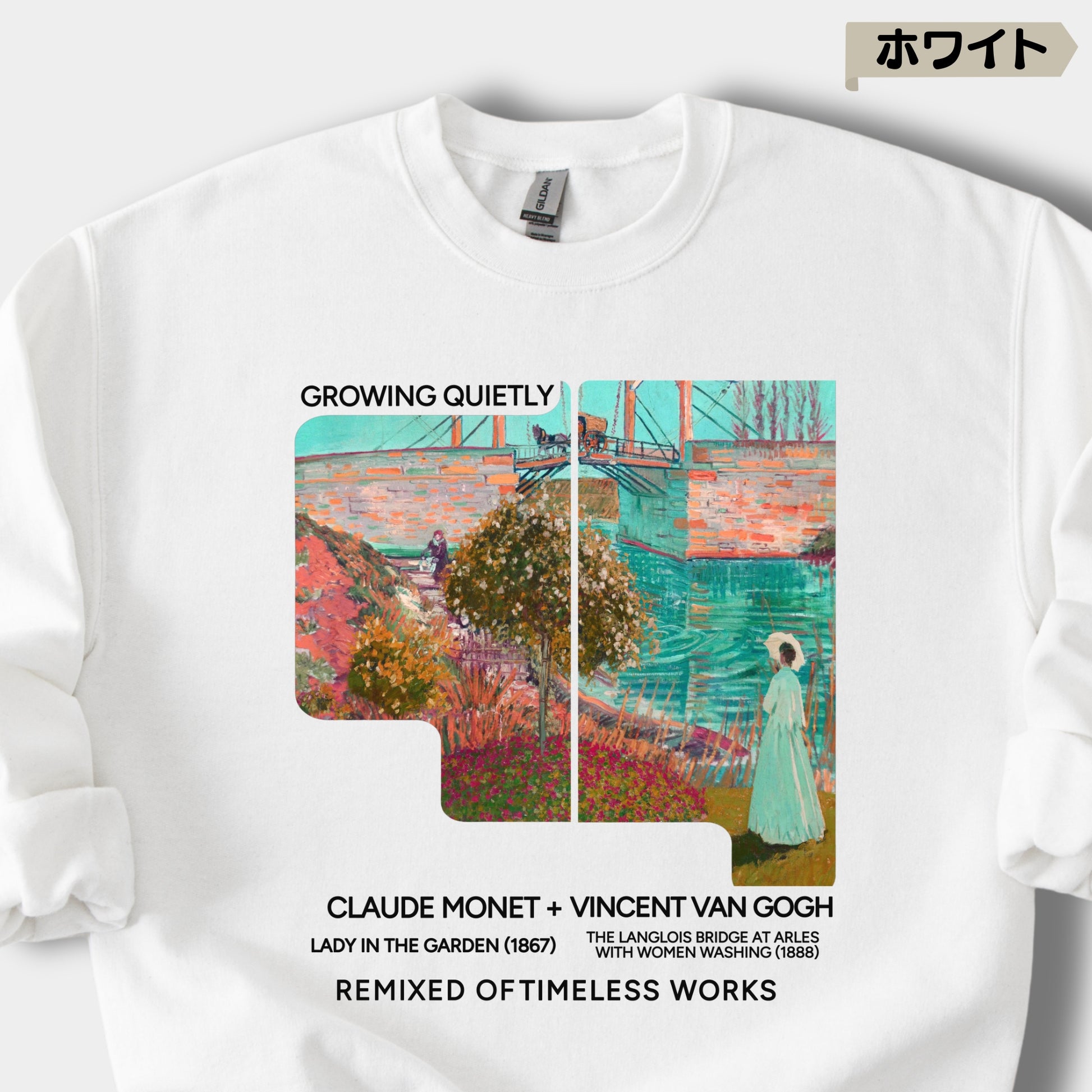 🎭“Growing quietly―静かに成長している”という静謐なアファメーションが、視覚の中にそっと溶け込むように構図へとリミックスされたスウェット。モネとゴッホという異なる時代の感情を、静かに、しかし確かに重ねていく。