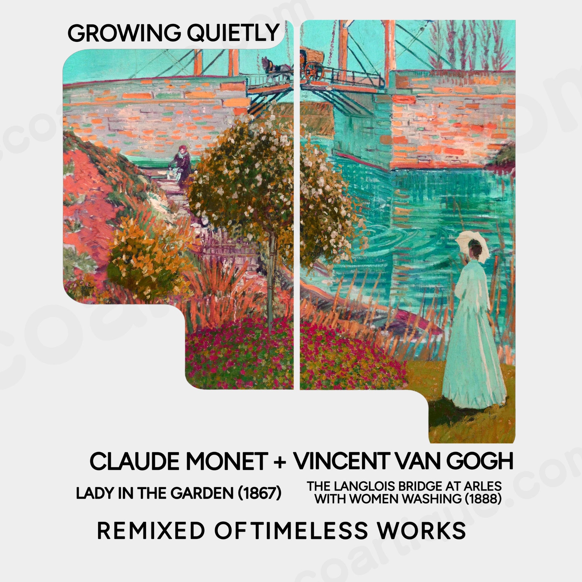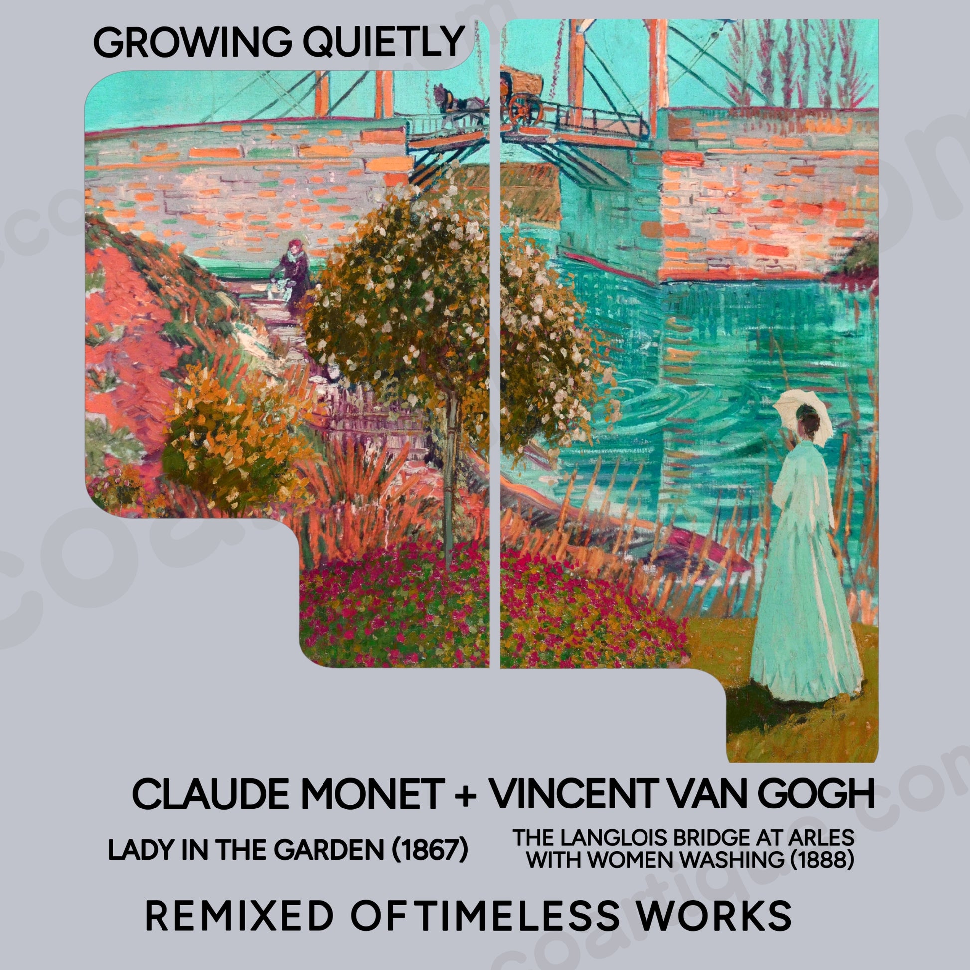 「FINE ART」の佇まいを日常に。モネ《庭の女性》(1867)のやわらかな光と、ゴッホ《アルルのラングロワ橋》(1888)の水面のざわめきが一枚の画面に再構成(Remixed)され、「静けさ」と「時間」の対話が生まれる。何気ない風景の中で、静かに育つものへの眼差しを宿したデザイン。
