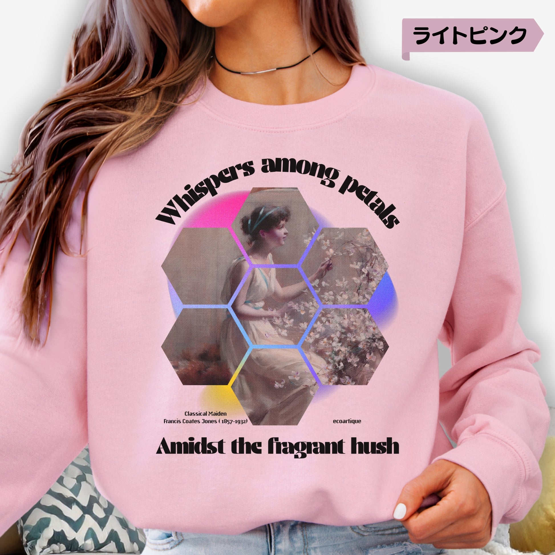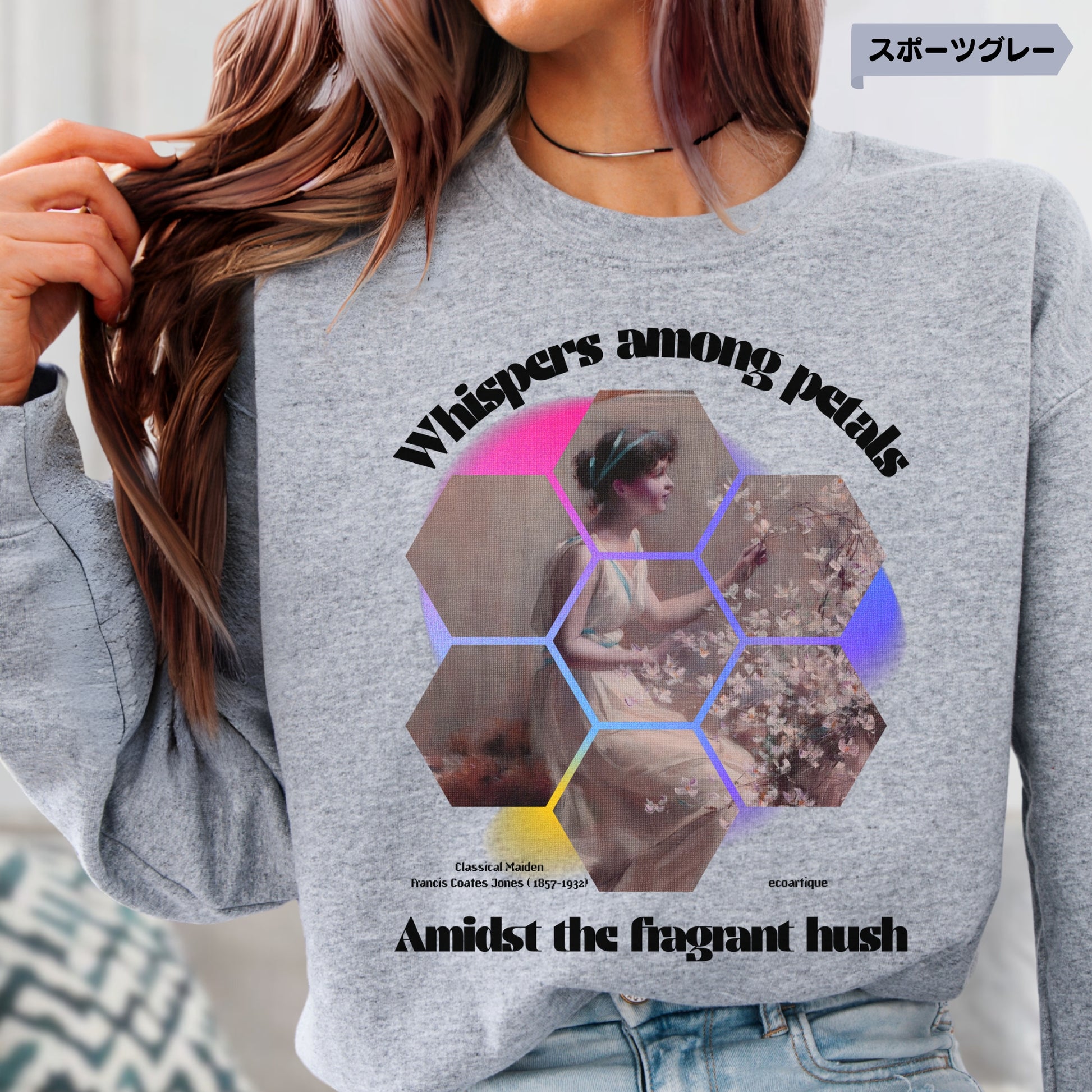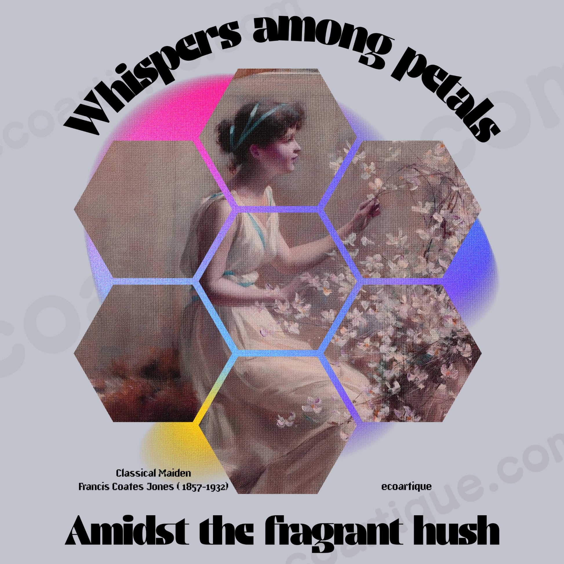 構図全体をハニカム状に分解・再構築し、視線を引き寄せるグラデーションエフェクト(ピンク〜イエロー)を背景に使用。ヴィンテージ絵画の柔らかい筆致と、印象的なアファメーションフレーズ「whispers among petals」「amidst the fragrant hush」を幾何学的に配置することで、「静謐」×「タイポ」×「構成」の視覚的リミックスを実現。全体にグレイン加工を重ね、触感すら感じさせるようなノスタルジアを演出。