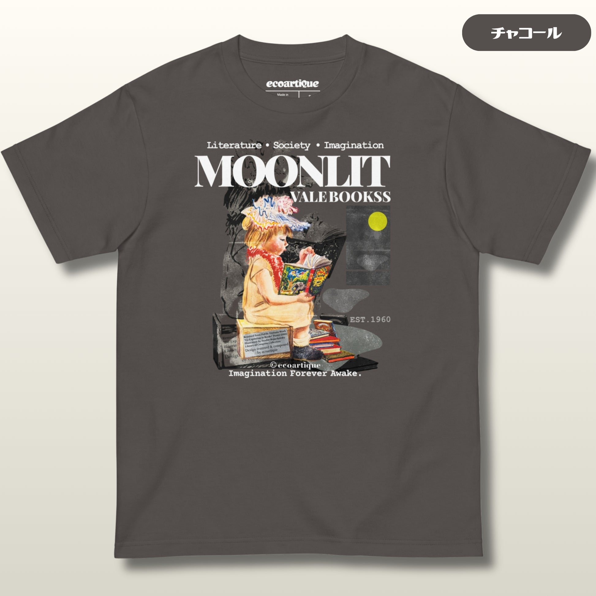 🎭「Moonlit Vale Bookss」は、月明かりに包まれた静かな谷にある架空の書店。その幻想的な世界観とともに、“Imagination Forever Awake”というフレーズが90年代のレトロな装いで輝く、空想と記憶が交差する一枚。