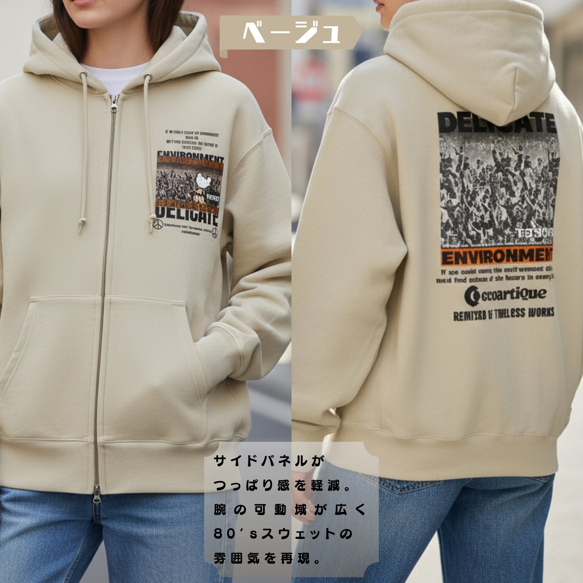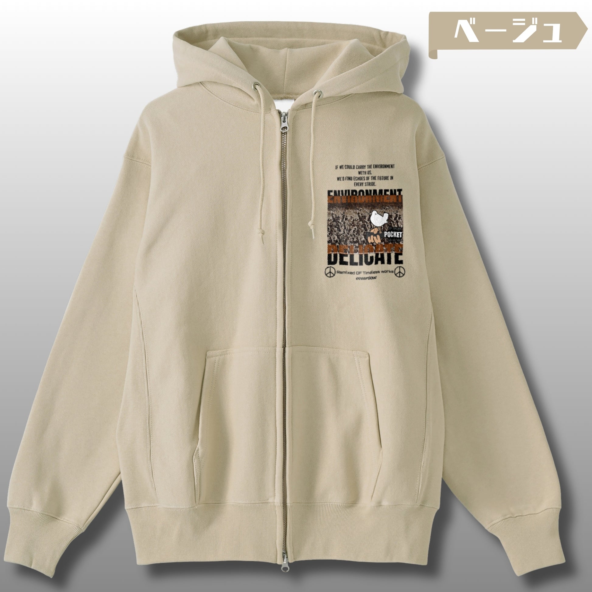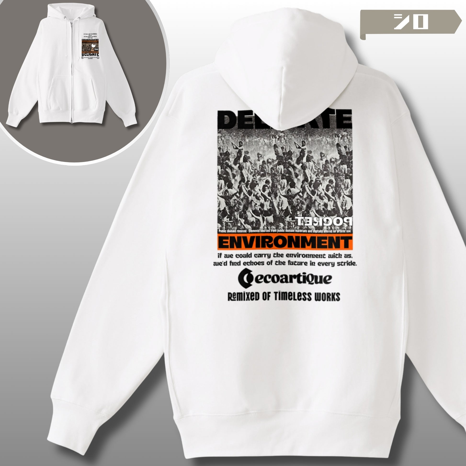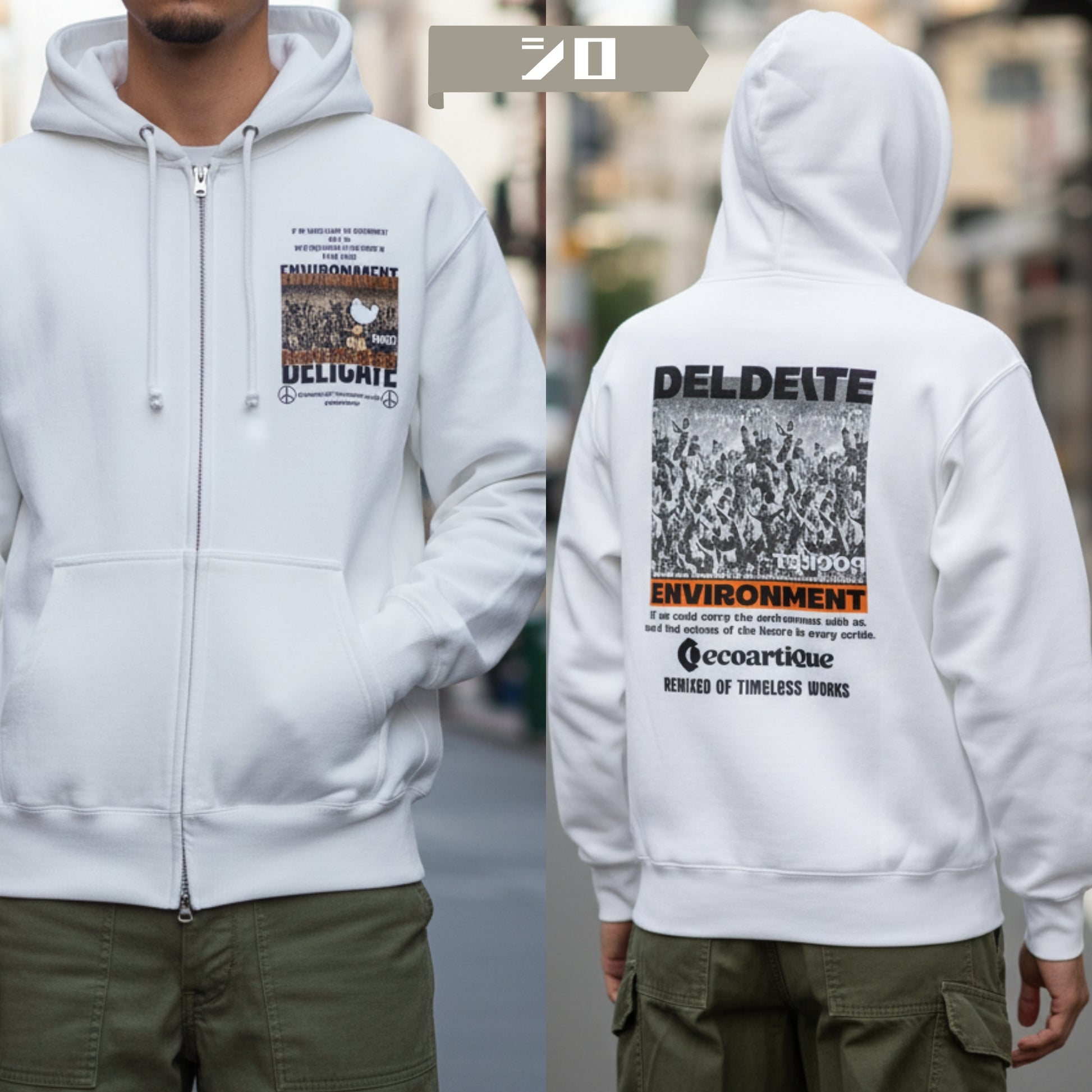 🎭「POCKET」「ENVIRONMENT」「DELICATE」のフレーズを軸に、70年代の野外フェスの熱狂と、現代的な静けさをつなぎ合わせたアートフルジップパーカー。古着のような質感と、どこかの時代から届いたような違和感が共鳴する一枚です。