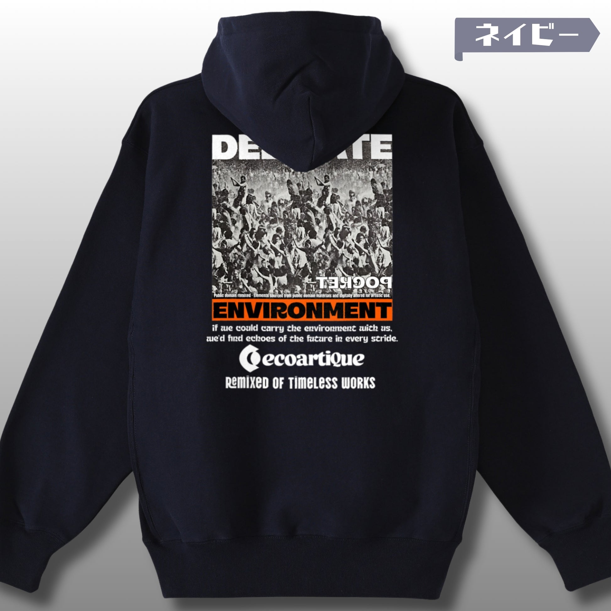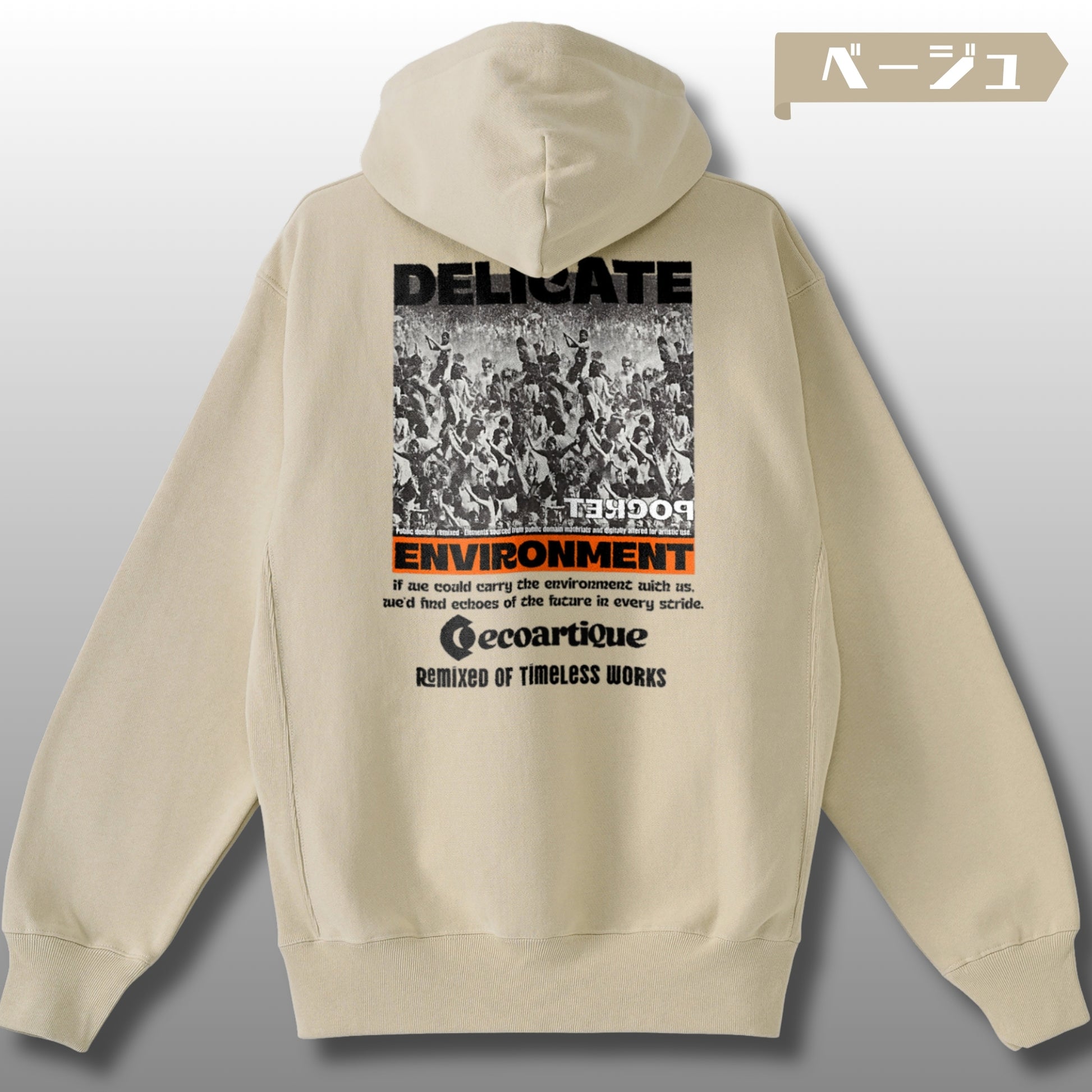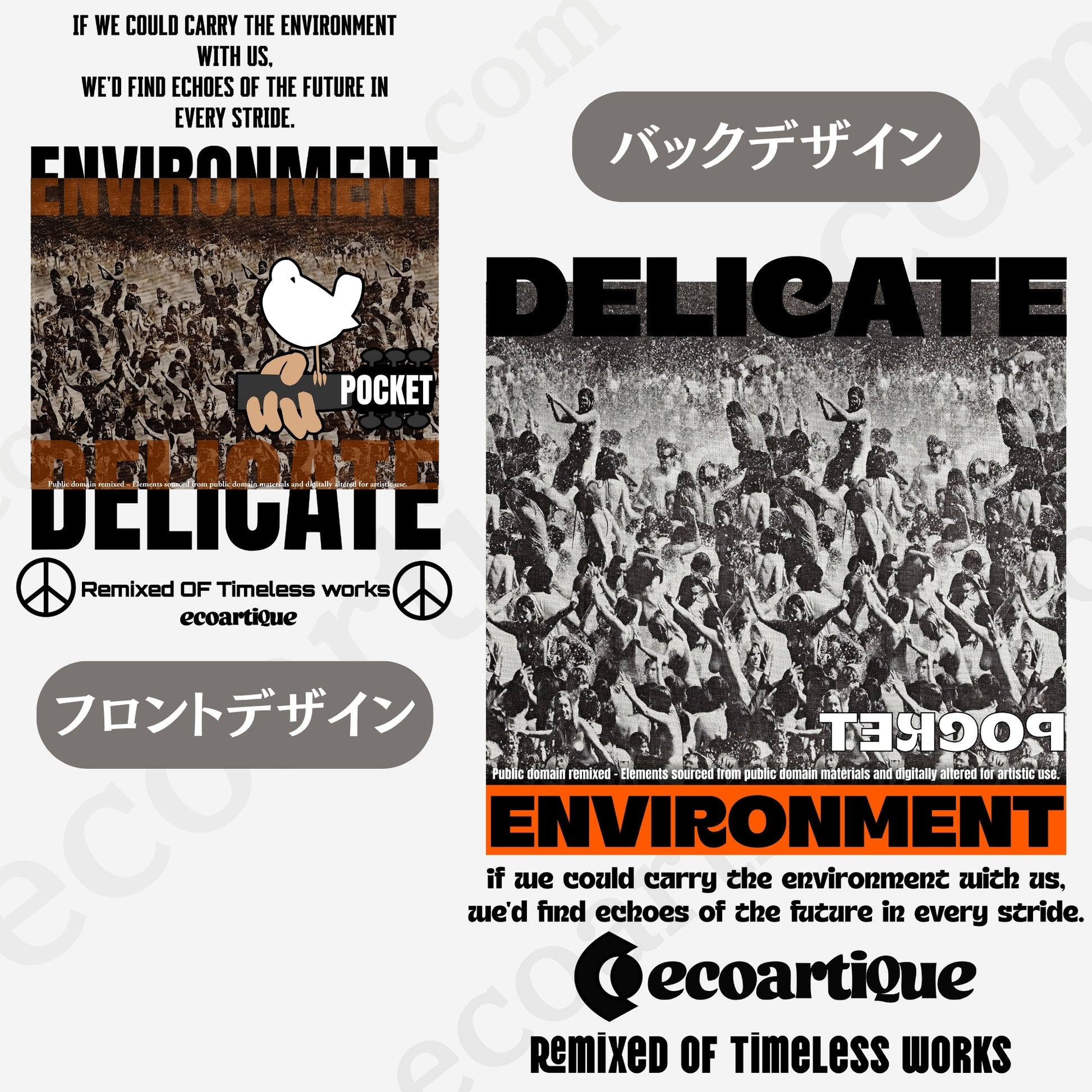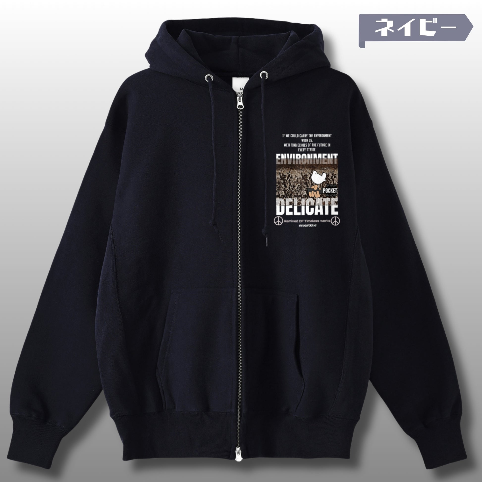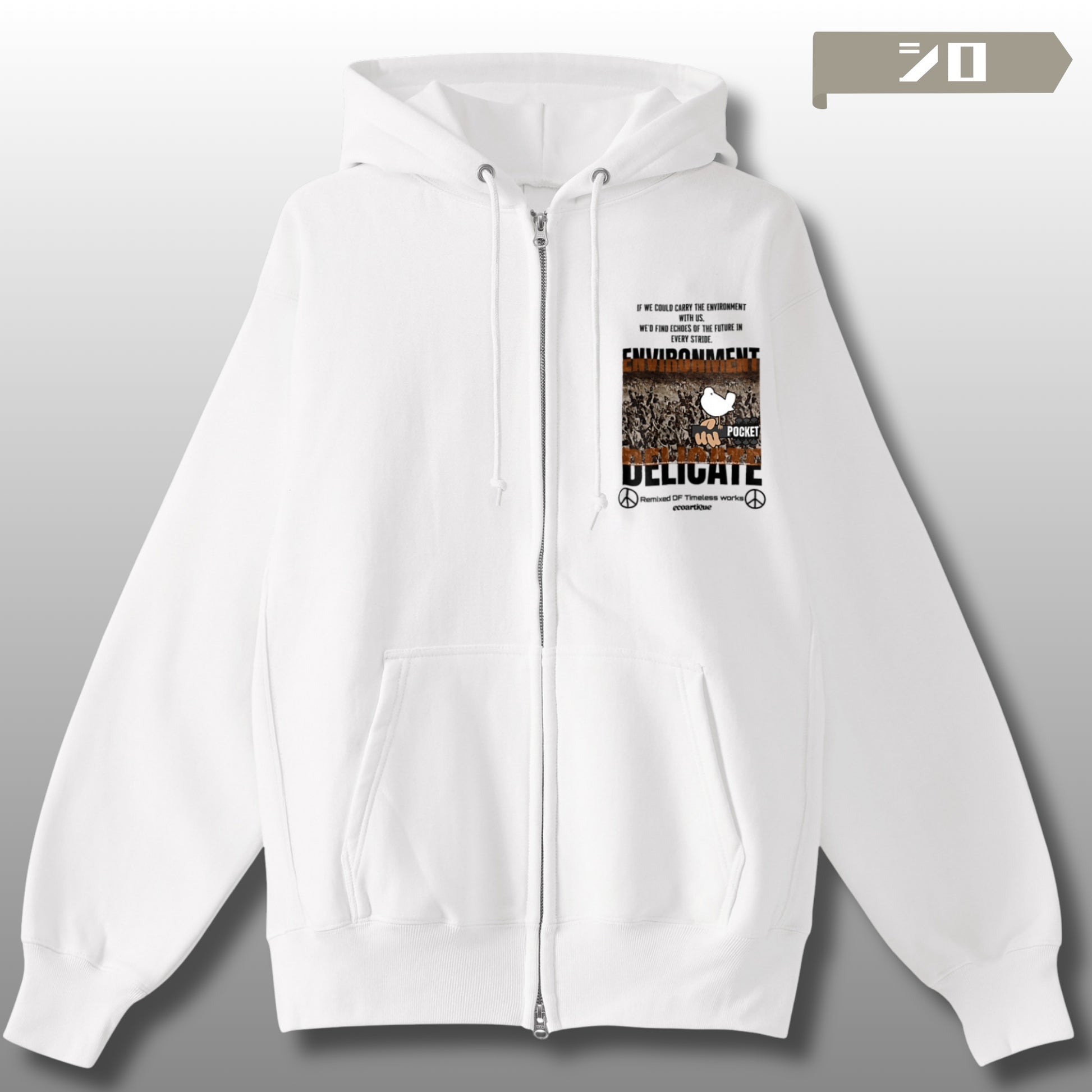🎭「POCKET」「ENVIRONMENT」「DELICATE」のフレーズを軸に、70年代の野外フェスの熱狂と、現代的な静けさをつなぎ合わせたアートフルジップパーカー。古着のような質感と、どこかの時代から届いたような違和感が共鳴する一枚です。