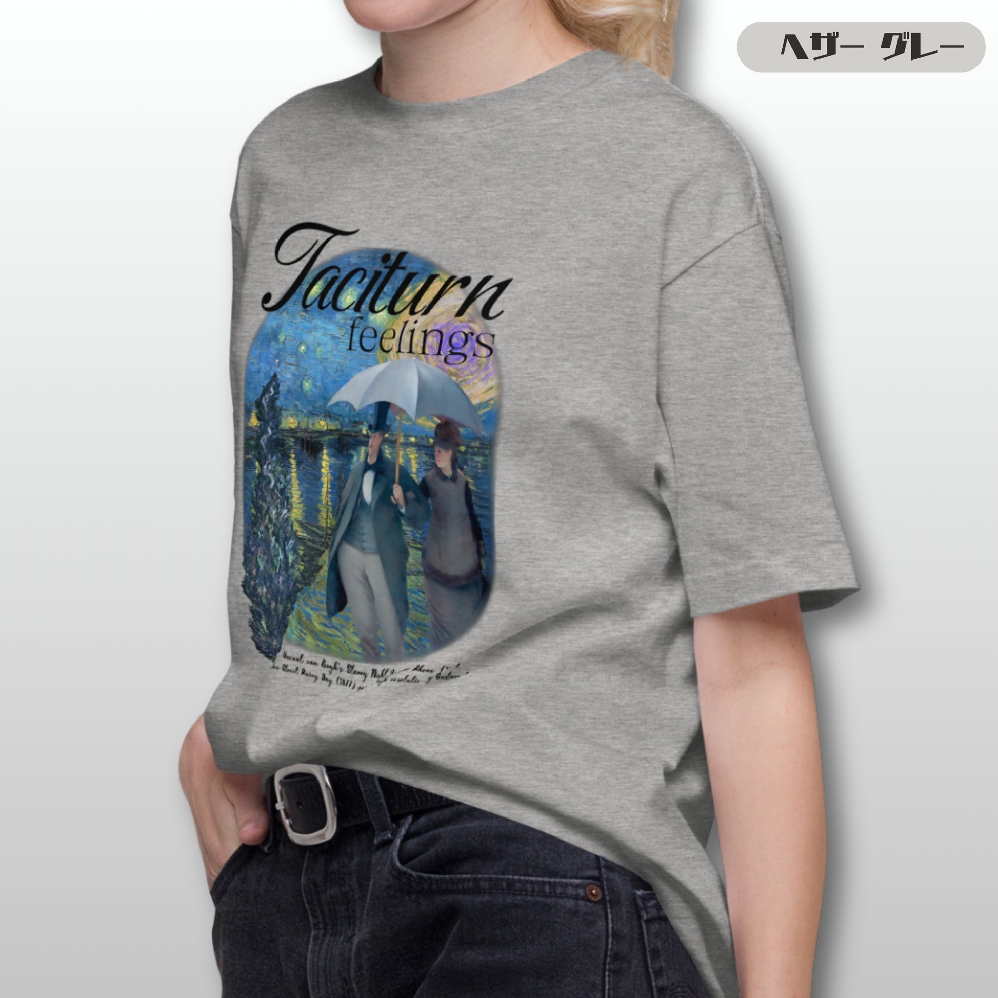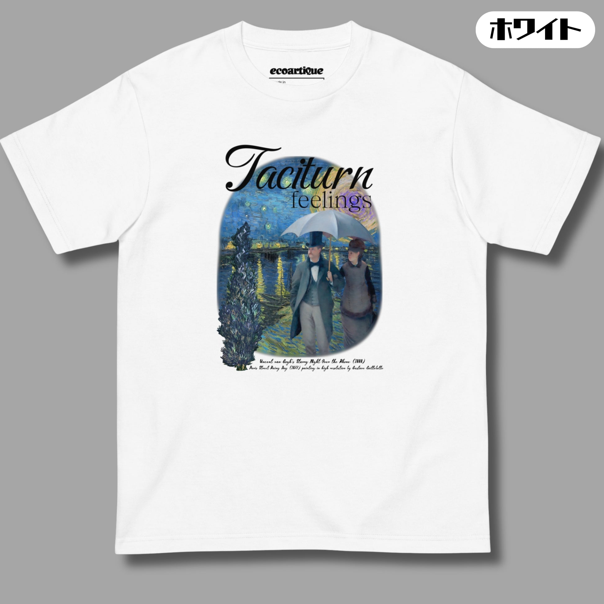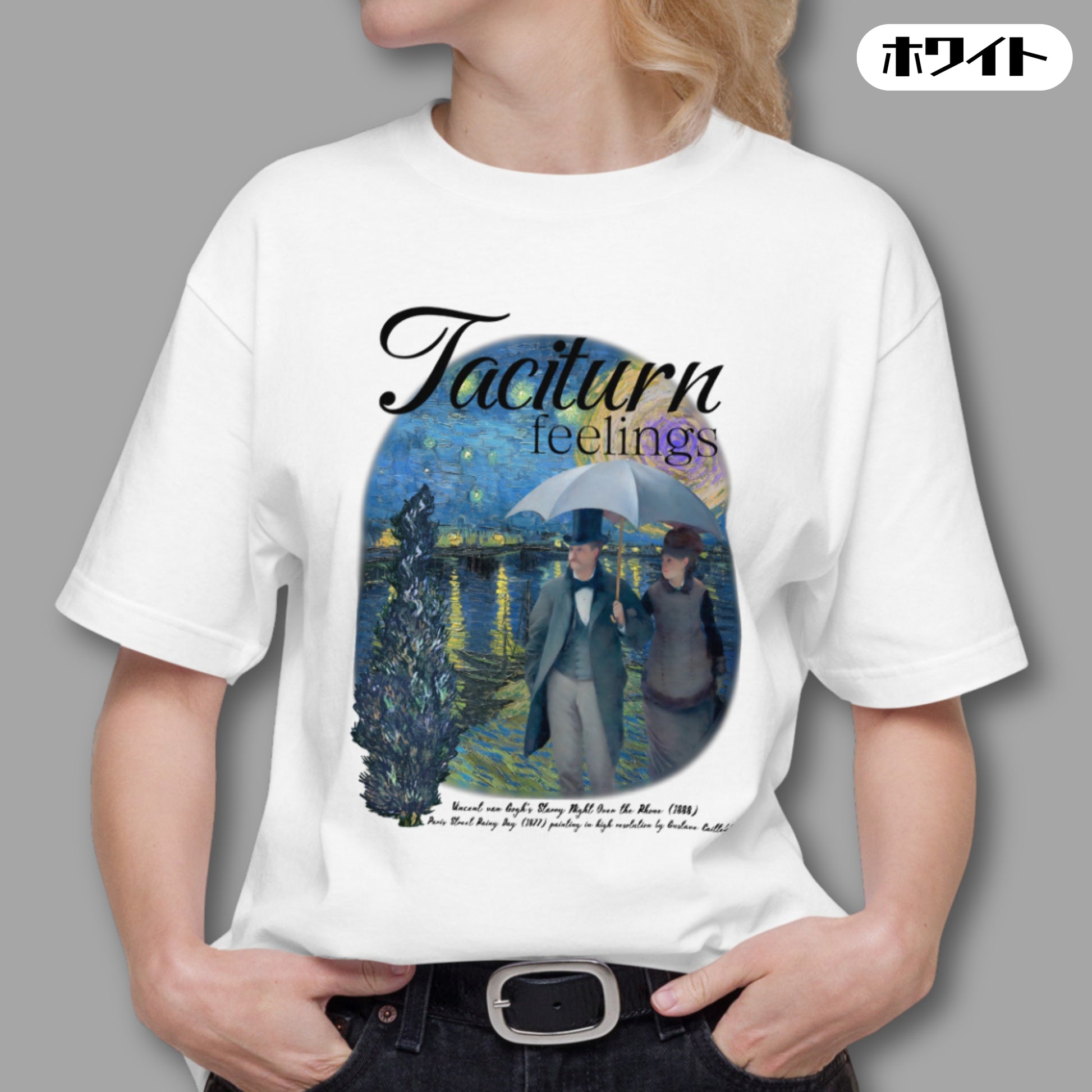 クラシックアートと現代的な感性をミックスした、軽やかで洗練された印象のグラフィックTシャツ。ゴッホやカイユボットなど異なる時代の名画を再構成し、「Taciturn feelings(無言の感情)」をテーマに静謐な佇まいを表現しました。