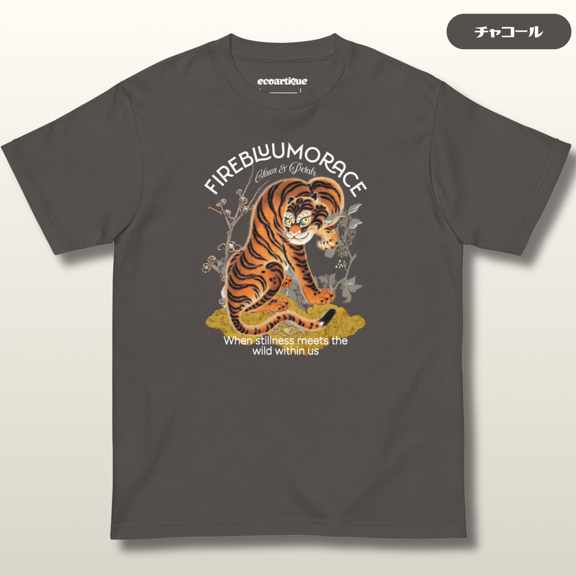 ⬛ Design 構図は中央に座る虎(松井慶中)を基軸に、左に北斎の果実枝、背景に金雲を配し、黒地とのコントラストで浮き立つよう再構築。浮世絵の筆致をヴィンテージ感として残しつつ、ダークトーンに映えるレイヤー感が魅力。タイポグラフィーには鋭さと柔らかさを併せ持つ曲線を用い、「FIREBLOOM TRACE」の文字が光の残像のように物語性を強調。フレーズ「When stillness meets the wild within us」が、闇の中に余韻を残します。