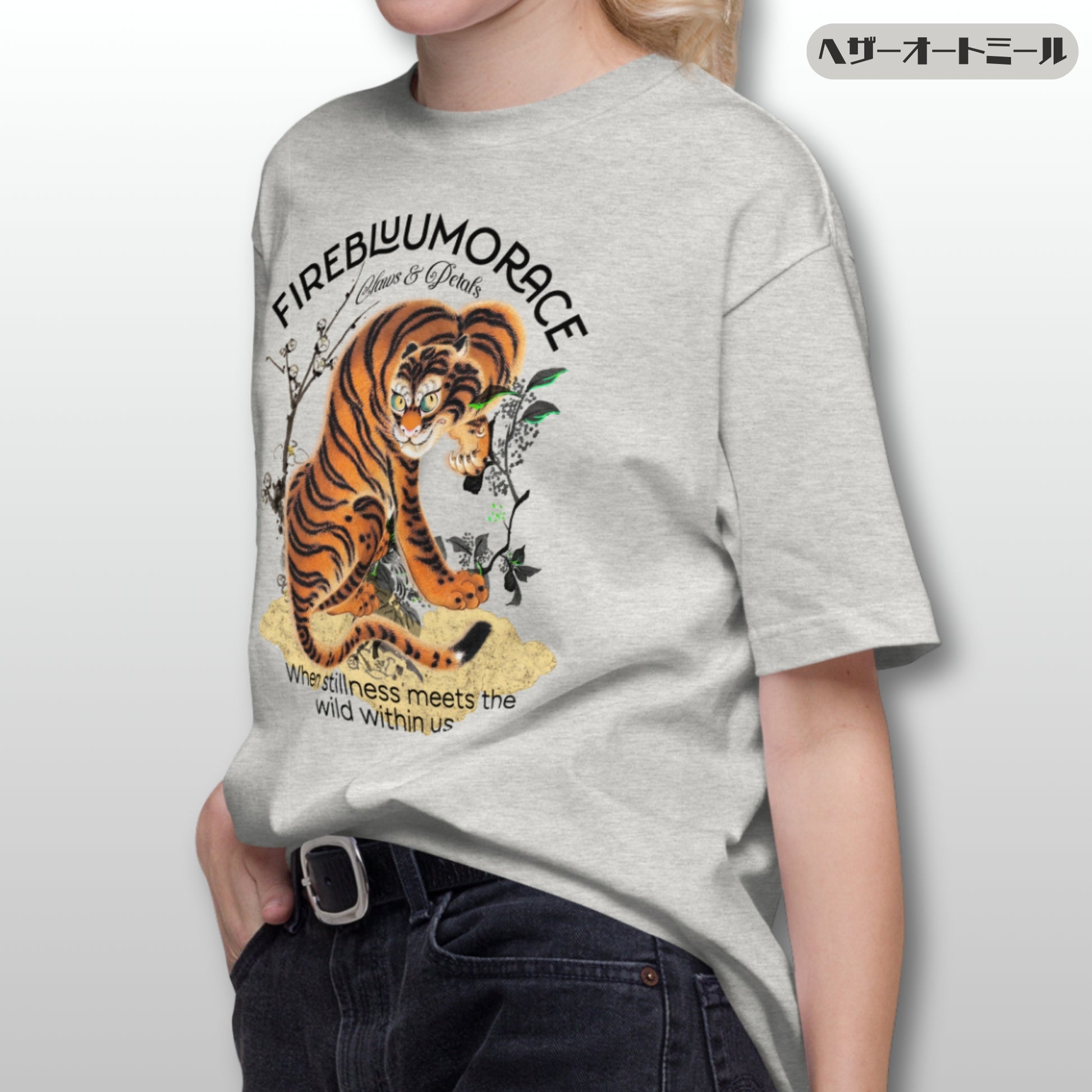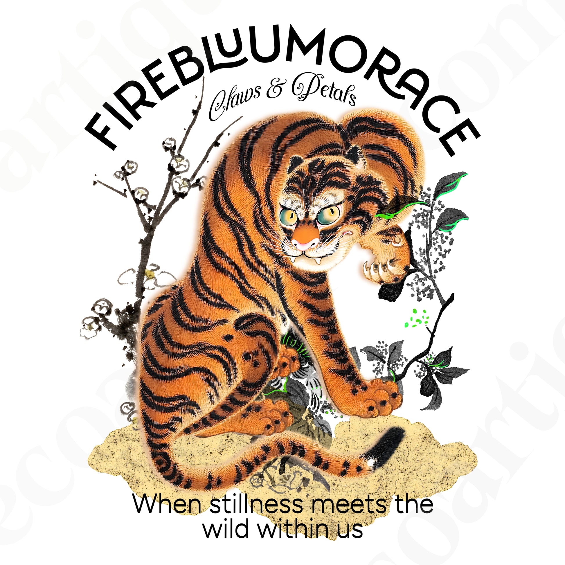 ⬛ Design 構図は中央に座る虎(松井慶中)を基軸に、左に北斎の果実枝、背景に金雲と花をバランスよく配した左右対称の和モダン構成。「ヴィンテージ」な浮世絵の筆致を活かしつつ、「再構築」されたレイヤー感が魅力。タイポグラフィーには柔らかさと力強さを併せ持つ曲線を用い、「FIREBLOOM TRACE」の文字が物語性を強調。フレーズ「When stillness meets the wild within us」が視覚の余韻を残します。