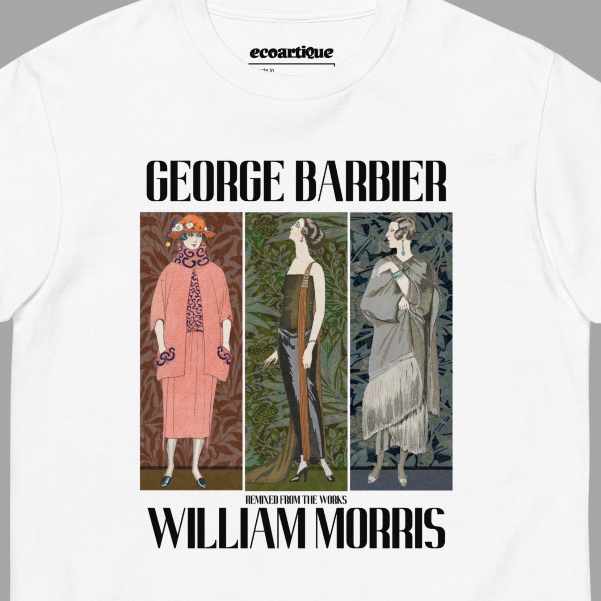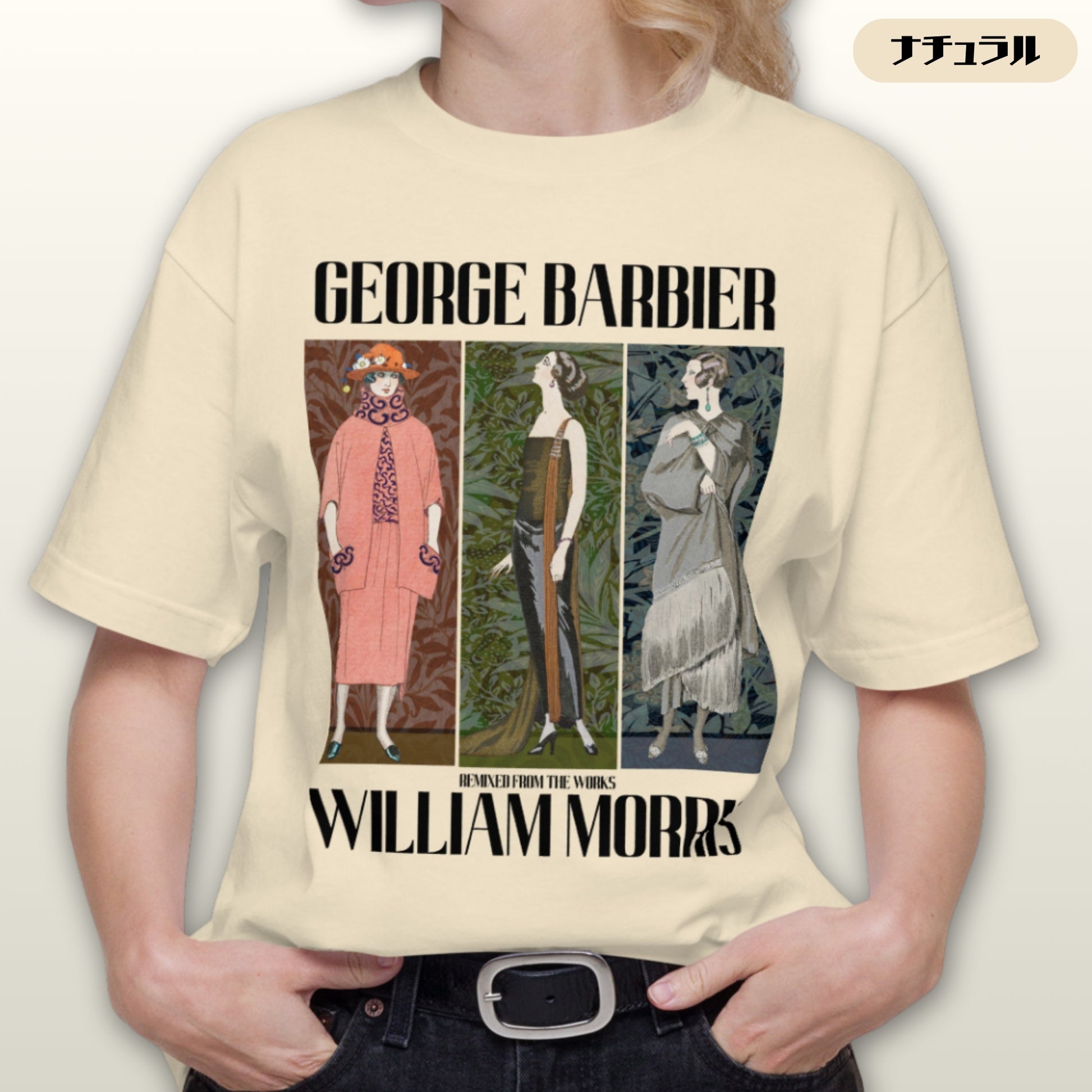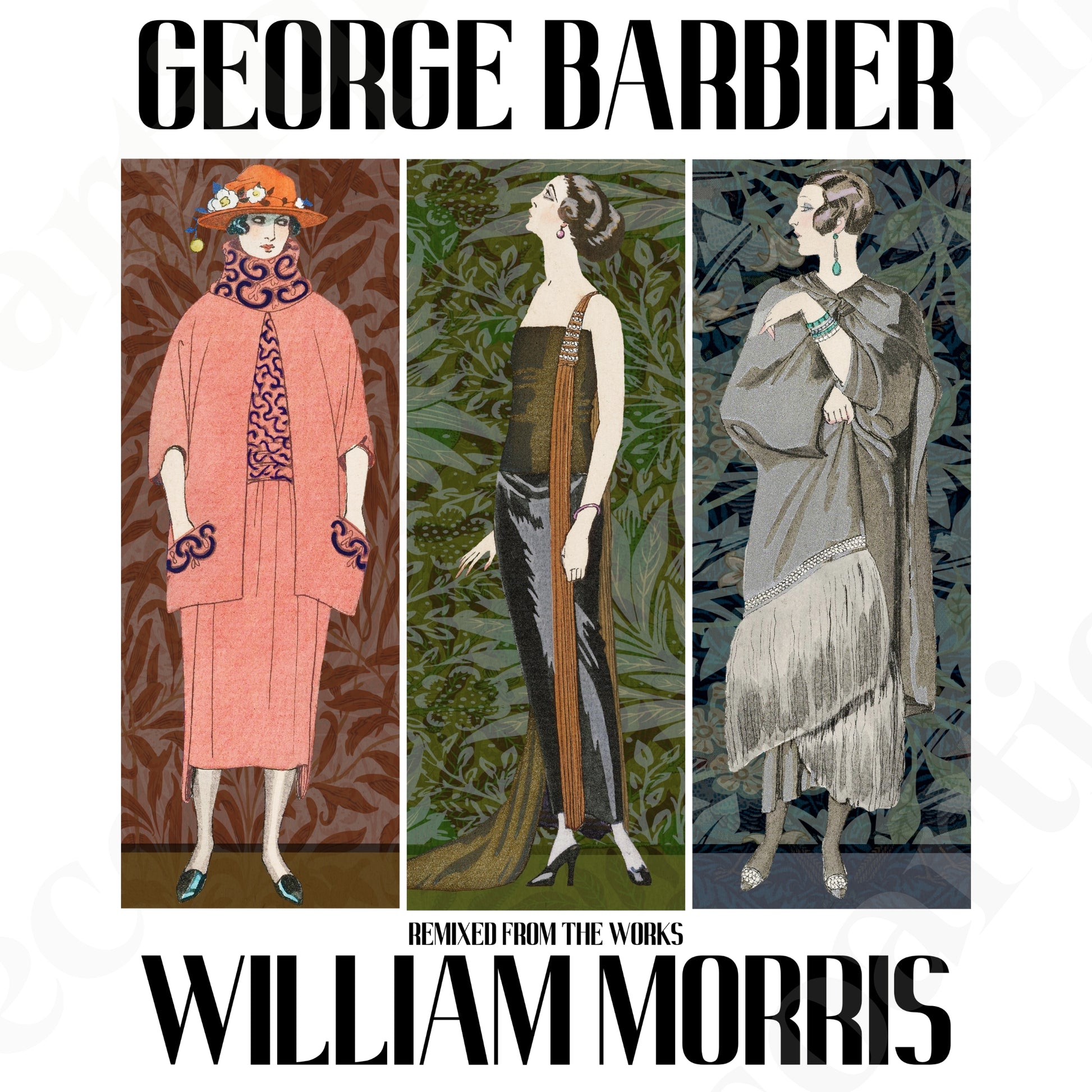 バルビエの直線的かつ優雅なファッションイラストと、モリスの緻密で生命力あるボタニカルパターンとの対話が、静かな余韻をまとった再構成(Remixed)を生んでいます。